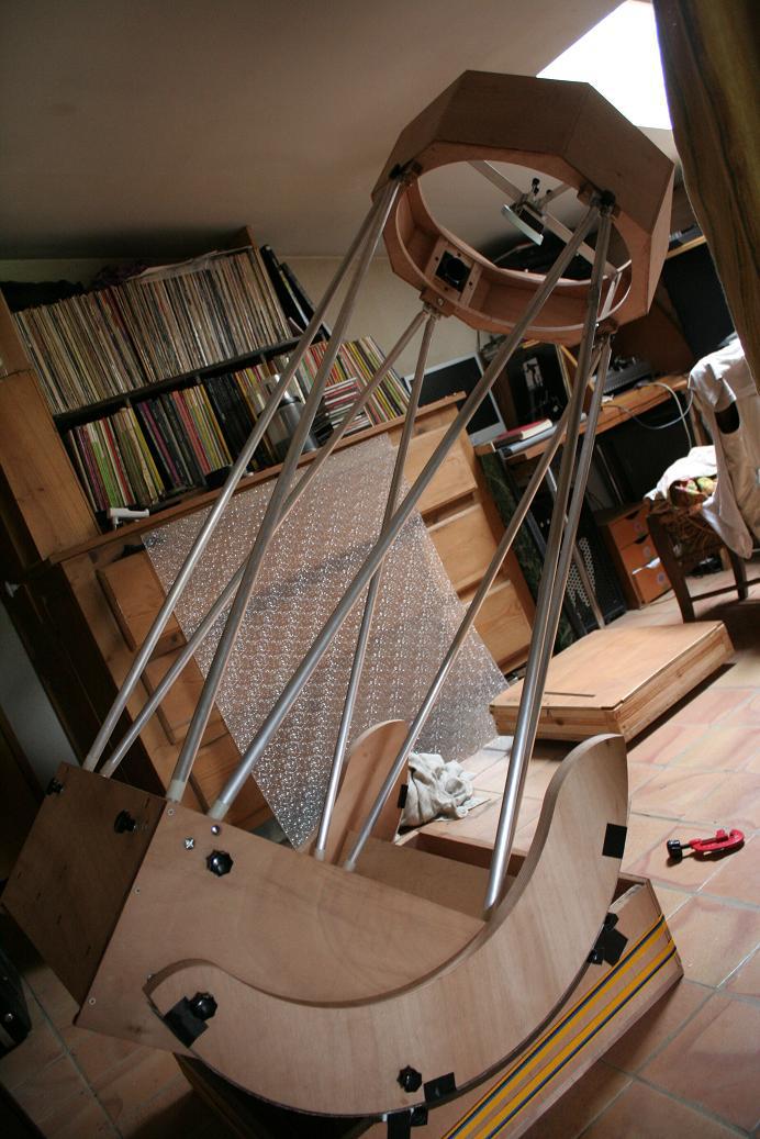 la machine a faire des télescopes : ze defonceuse ! faut pas hesiter a ne pas utiliser la pointe fournie et faire un vrai axe qui traverse l'etabli et les epaisseurs de bois. avec de la tige filetée, du tube alu des rondelles,acier et nylon , ecrous oreille on fairt des merveilles.