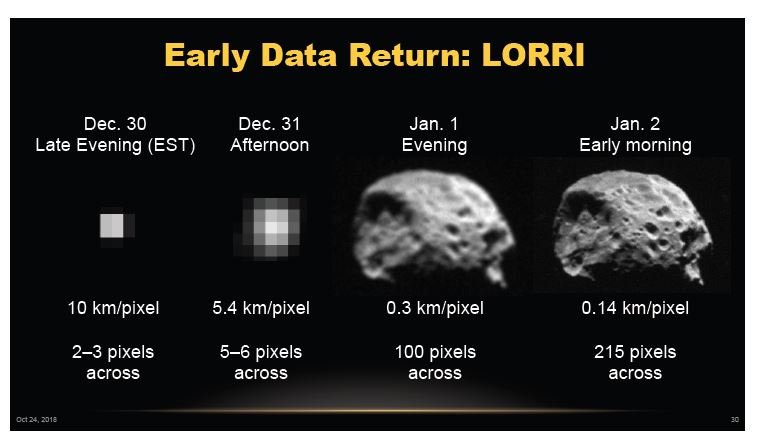 cette simulation de la résolution est à première vue de cette "planche" assez intrigante (pour ne pas dire trompeuse). Car on pourrait croire que ce sont les images les plus récentes vues par un instrument de New-Horizons (LORRI) , alors que cela prend un exemple d'une lune de Saturne et anticipe ce que seraient les vues le jour du fly-by (?) (puisque  les dates de fin décembre - début janvier sont affichées ...  mais pas l'année, cadrent bien avec celles du fly-by à venir  ??? ) et que cela collerait donc Phoebe dans l'objectif en lieu et place de Thulé (??? en tout cas c'est ce que j'en ai compris).