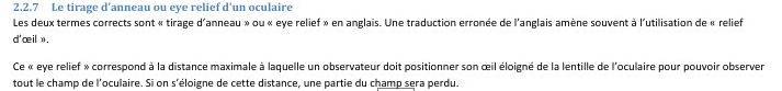 C'est globalement vrai mais il s'agit plutôt de la distance recommandée pour placer sont oeil car le "eye relief" est la distance entre la pupille de sortie et la lentille d'oeil de l'oculaire (première lentille frontale) et comme chacun sait il faut placer son oeil précisément au niveau de la pupille de sortie pour voir tout le champ car un peu trop devant ou derrière est on loupe une partie du champ (ça vignette comme on dit).