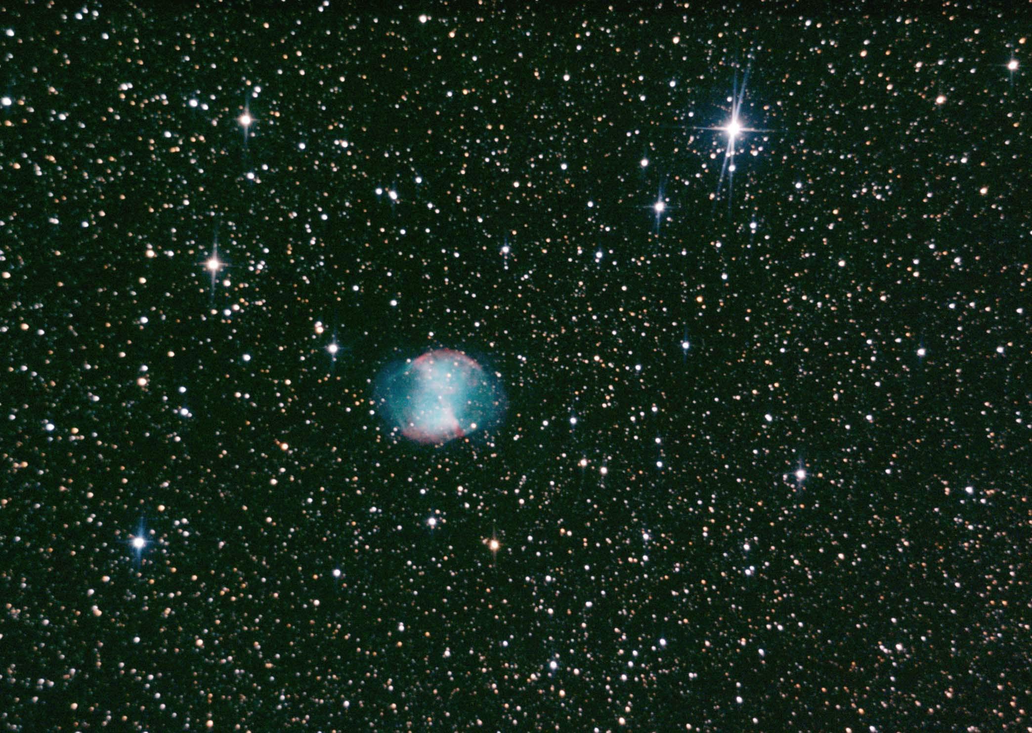 Elle est bien belle cette M27. les nébulosités bleues sont bien captées. la chaine de traitement est bien faite. Je vois juste une dominante verte sur le fond, ça devrait se corriger avec toshop