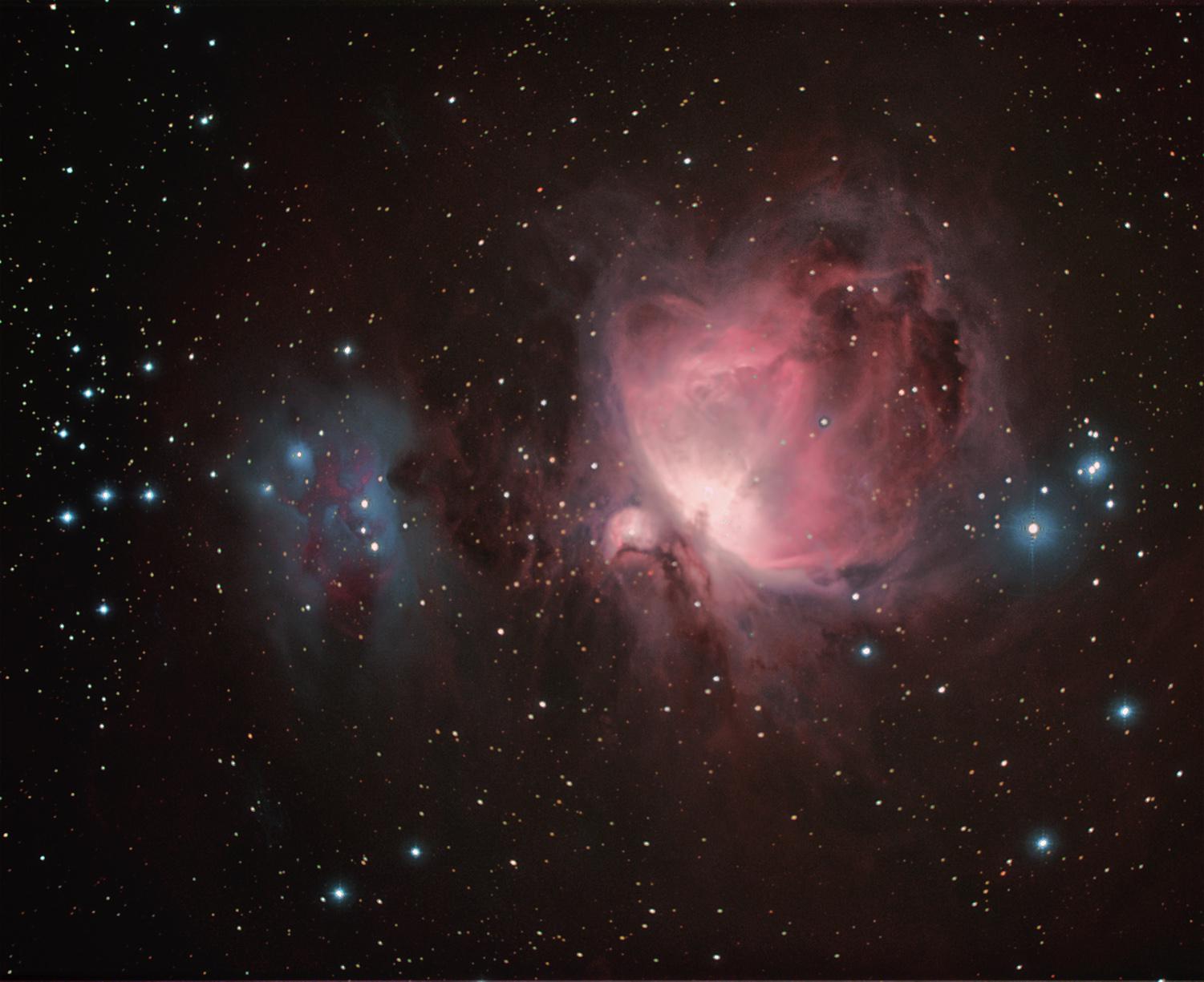 Prise dans la banlieu d'Aix les bain, avec une PL assez forte qui oblige à utiliser les filtres anti pl, ce qui allonge ennormément les temps de pose, même avec l'hyperstar. Turbulence forte (FWHM 5). La première série à été faite il y a presque un an avec un adaptateur d'hyperstar différent, la planéité était meilleure, mais M42 déjà basse et dans la PL d'Aix. Le filtre lumicon deep sky coupe aussi plus d'infos utiles que le Idas LPS2 et la balance est dure à récupérer. (l'image ressemble à une Ha-RGB) Puis j'ai ajouté un tiroir à filtre et il a fallu tout reprendre, c'est pas fini...mais bon j'ai empilé les images quand même :