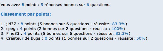 En fait, je n'hésite jamais à consulter le web dès lors que je n'ai pas été en mesure de répondre correctement. Je suis donc parfaitement d'accord avec toi quant au caractère enrichissant de ce quizz.