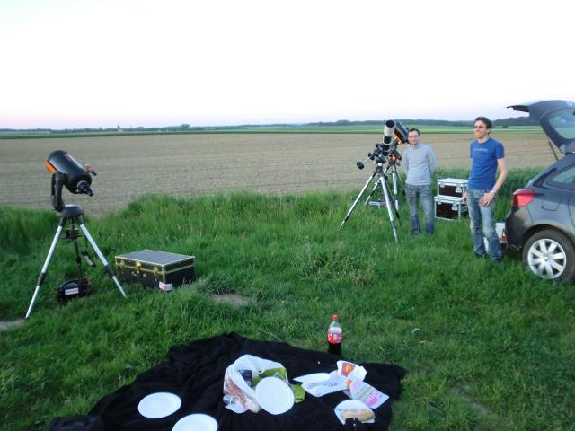 Une ch'tite photo des préparatifs hier soir : mon C8 (enfin plutôt celui de Stéphane ANGLARET qu'il m'a gentiment prêté) sur sa monture de Nexstar 6 en avant plan, le setup de Julien & Ronan à l'arrière-plan.