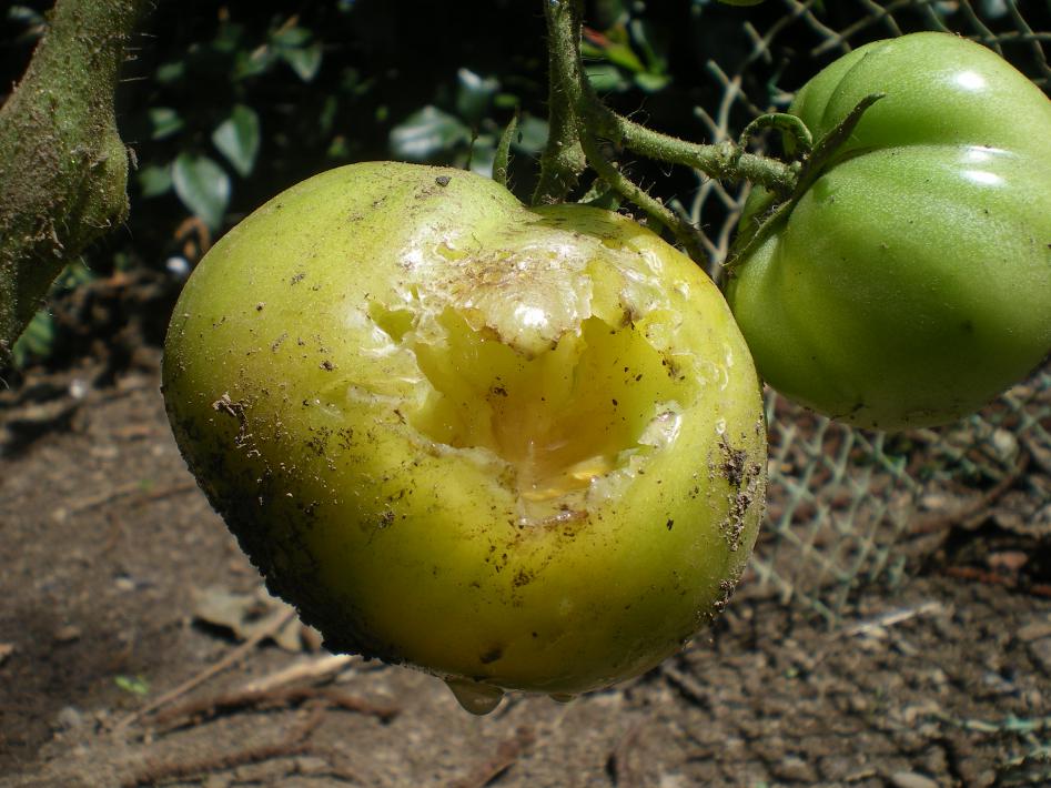 Il semblerait que ces tomates délicieuses qui ont résistées à la grêle genre glaçons dignes de l’apéro, ont subies une attaque sournoise.