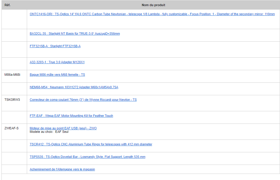 pour ça: $avec un secondaire de 110mm pour très peu de vignetage et toute la quincaillerie haute gamme qui va bien avec: Je dois prendre de l'âge, puisque ma focale descend à 1600mm, ce qui devrait être top avec la 6200. Le seul truc qui m'embête est que je pourrais plus me moquer de vous.😚 la seule inconnue est comment l'EQ8-Rh va gérée le moment d'inertie additionnel du au tube plus long. En bonus, pouvoir faire une collimation laser ultra précise de jour. a+ Serge0 point