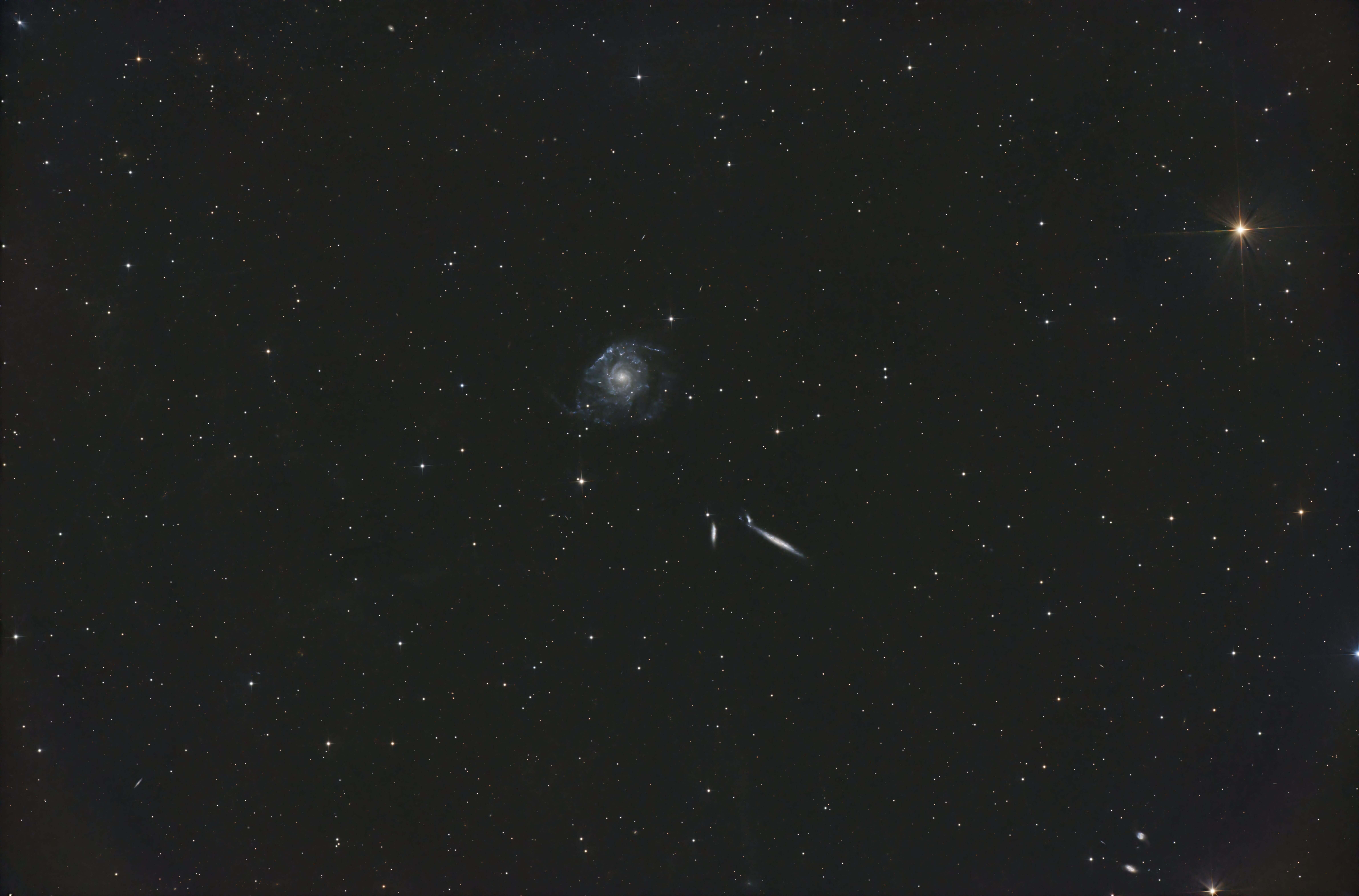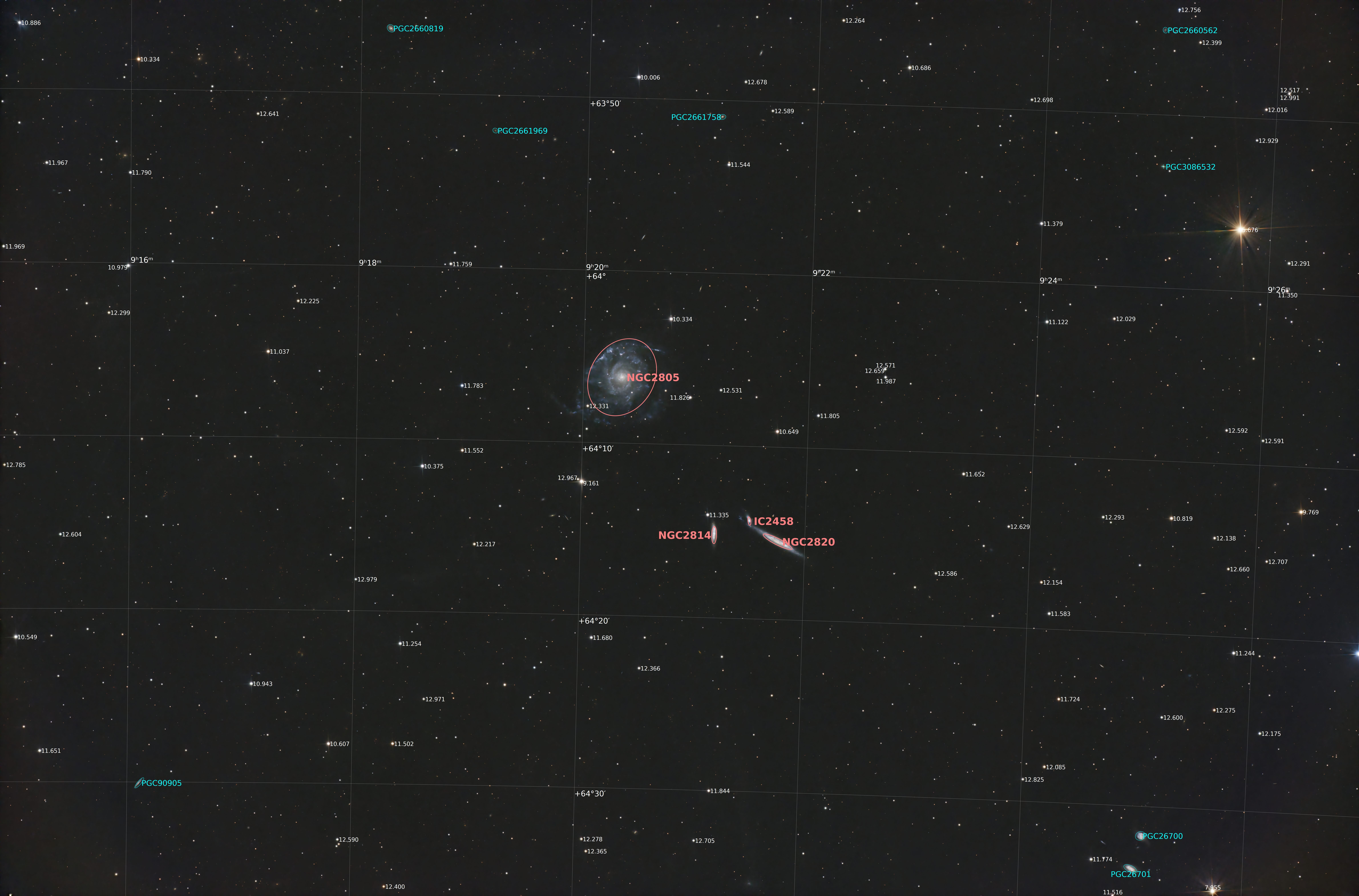 Salut, alors hier soir les cirrus sont venus troubler la fête. Je n'ai donc pas ajouté de temps sur cette image qui est une mosaique de 2 panneaux. Chaque panneau représente un peu plus de 6h d'accumulation par poses de 30s. prises de vue les 1 et 2 mars. C8 à F/6.3, Altair 26C sans filtre toujours en ville sur AZEQ6. Prétraitement Siril et finition Pix Je voulais la poster hier soir mais j'ai galéré à faire ma mosaique car j'avais oublié que le GradientMergeMosaic se fait avant BlurX ! Sinon artefacts à gogo. J'ai repris le traitement ce matin. Sinon, comme ces galaxies ne sont visibles quà partir de 21h chez moi, j'ai laissé tourner un peu sur M1 en attendant que je vous mets à la fin du post. Ce soir ça revient bien ! 🙂 Sam la version annotée et M1 (1h30) pour passer le temps (RGB sans filtre) traitée en 5min0 point