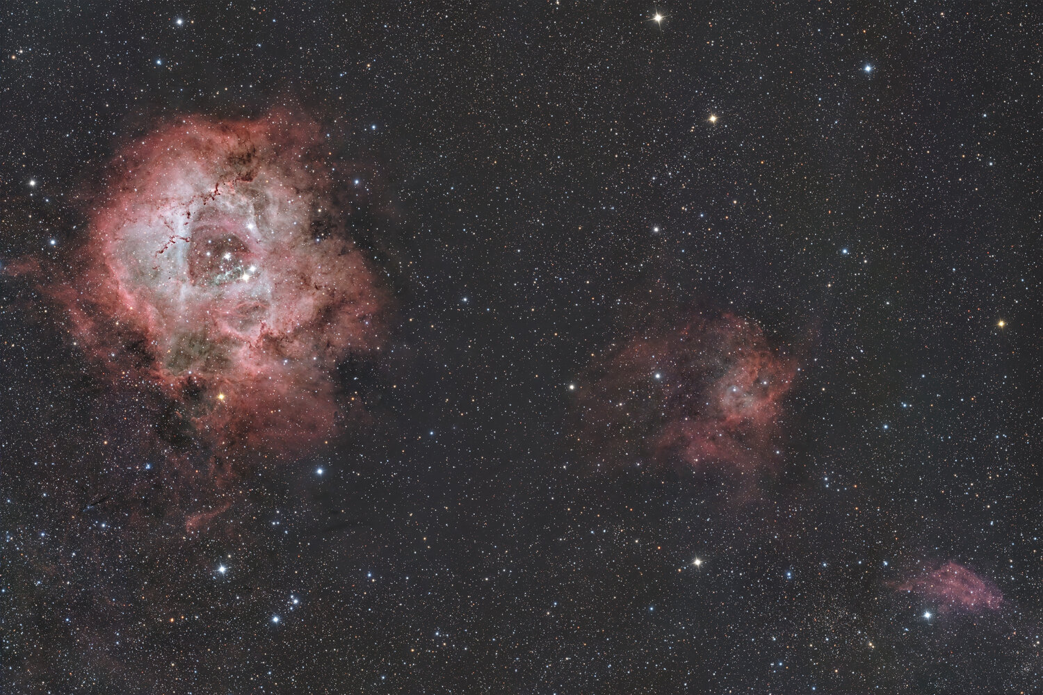 Salut à tous ! Bon, me voici à vous partager un champ pris les 28/02 et 01/03 derniers de NGC 2237 (Rosette) à NGC 2262, en passant par SH2-280 (au milieu) ! A peu près 6h de conservé, pris avec l'Askar SQA55 et l'Altaïr 26C + Filtre Antlia tirband RGB. Suite des prises "d'hiver" à 265mm de focale donc ! Prétraitement Siril/Sirlic Traitement pix habituel rapide (GradientCorrection / SPCC / BlurX / StarX / Star stretch Seti astro / EZStretch Starless / NoiseX ) Ajustement starless sous PL8 par zones Assemblage + StarPikes et export JPG J'ai eu pas mal de difficultés avec le fdc cette fois curieusement, je n'arrive pas à savoir pourquoi, en outre une gradient à droite un peu bleu compliqué (peut être l'éclairage de ma maison car j'avais des amis ce soir là...) Voila voila !1 point