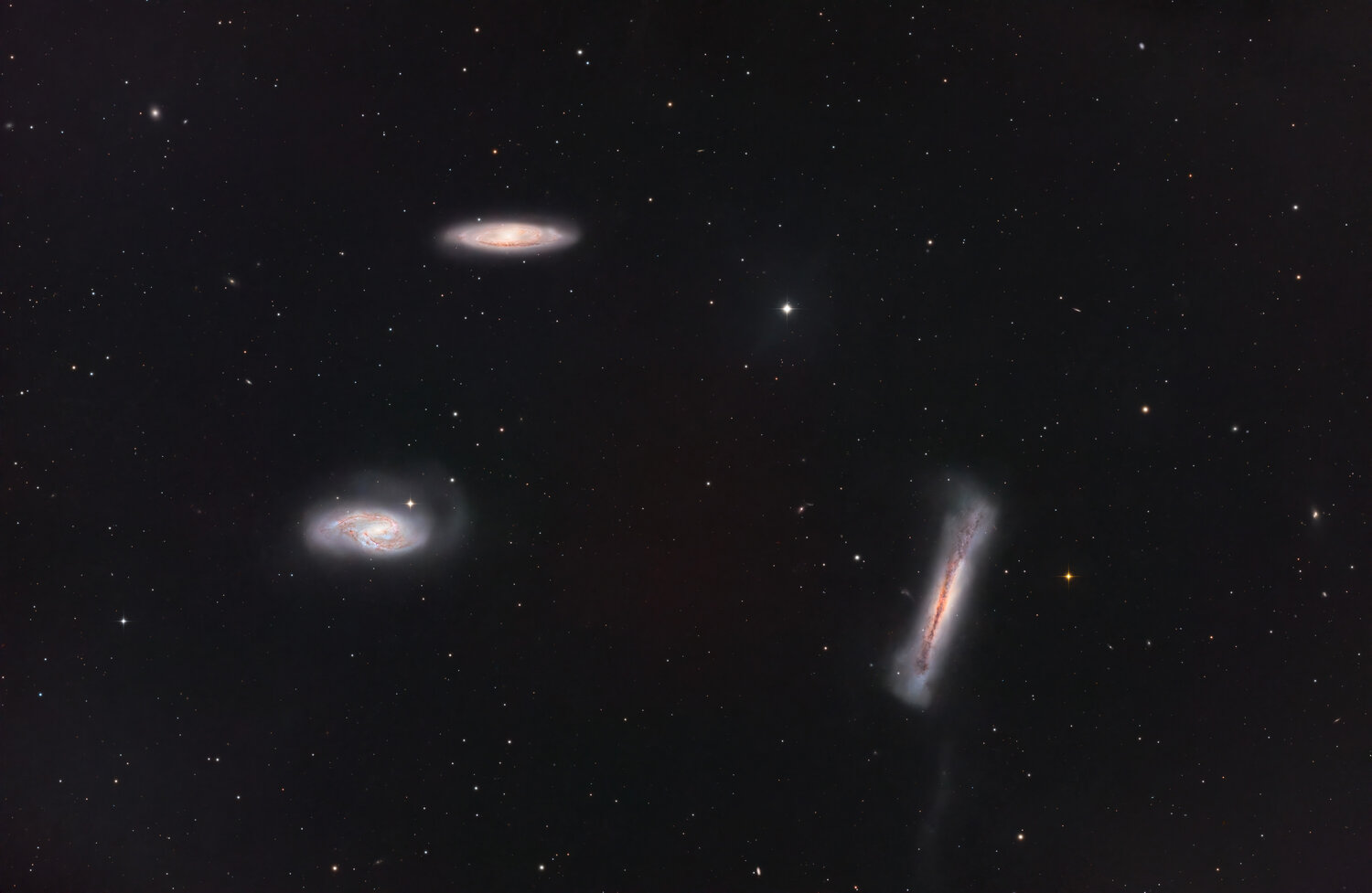 Bonsoir tout le monde !! Bon, j'ai réussi laborieusement à avoir 3h30 de L et 30mn de chaque R/G/B, en jetant un bon tiers des prises...à cause du temps...ça m'a donc pris 3 nuits pour tout avoir (mais fait un peu de C38 aussi) ! Néanmoins, le tri des prises termine avec une FWHM à 2.4", avec un seing vraiment pas ouf et humidité... J'ai qd même choppé le début de l'éjection de matière de NGC3628...mais bon, ça mériterait le double...c'est sûr ! Prise donc faite avec la CF-APO 130 à 910mm natif, caméra Altaïr 26M le tout sur l'EQ6r. Ca commence à se roder et les performances semblent plutôt bonnes. Tilt mesuré à 4% sur la séquence, Eccentricity en moyenne à 0.37 sur pix. pré-traitement habituel Siril/Sirilic Traitement pix Staralign sur la L et DynCrop Léger GradientCorrection ChannelCombination R/G/B -> RGB BlurX L / RGB NoiseX sur RGB puis EZStretch StarX SelectiveColorCorrection (saturation) Sur la L StarX Stretch Seti pour les étoiles -> stars EZStretch sur Starless, puis NoiseX Mixage HDRMT 0.3 Combine Starless+Stars ImageBlend L + RGB StarX Export PS Ajustements + denoise Starless StarPikes sur stars Assemblage puis export jpg Voilà, à vous ! (clic droit pour la full)2 points