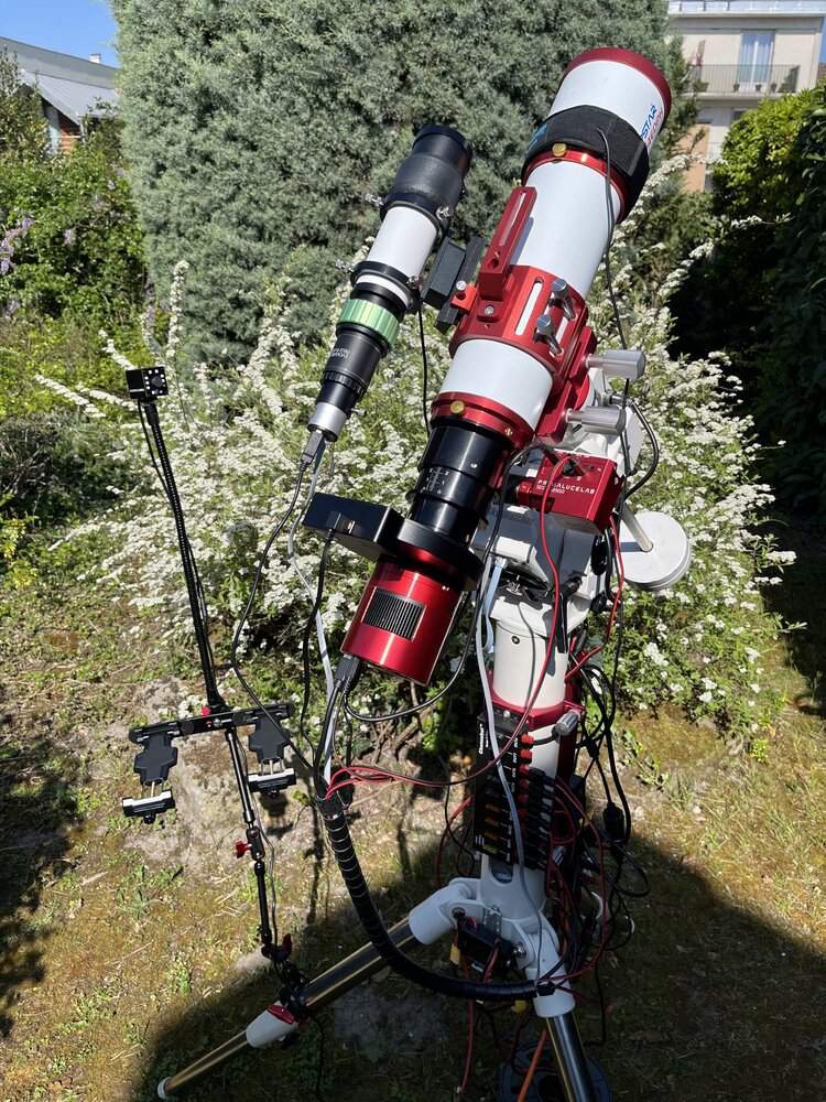 Salut @GeoffreyJoe de mon côté: -NEQ5 + SW 150/750 PDS -kit dual axe raquette rouge -lunette chercheur 60/240 et Player-One Ceres M 462. Retour express: un seul essai, et j'étais à 1.38" RMS sans rien régler dans PHD2, et avec la 240 montée sur un support chercheur. Honnêtement, çà change la vie. Je peux enfin dépasser les 30s... Avant, à partir de 1 min j'avais 70% de déchets. J'ai fait 2 min (j'ai pas encore testé plus) avec des résultats meilleurs que 30s. L'EQ5 a beaucoup de potentiel, certains ici sont passés sous les 0.5", et je pense que prochaine fois je tombe sous les 1" facilement: -j'ai changé de support (j'ai un rail femelle Vixen entre les 2 colliers du télescope, et des anneaux avec un rail mâle plutôt long pour le chercheur). La flexion, c'est le pire ennemi... -je vais passer en algo prédictif. -je vais faire une méthode drift pour l'alignement via PHD2. -je vais pas chasser la turbulence (j'avais des expos de 0.1s... Je vais monter à 2s). -et je sais comment régler PHD2. Inconvénients: -çà me demande de ramener encore plus de cables, mon portable, une table, une power station, en plus du matos de guidage. -çà demande encore plus de temps de montage, et encore plus de temps de préparation. Je pense que çà me rajoute bien 1h - 1h30 pour démarrer... Entre le montage, le démarrage des logiciels, le réglage de la cam de guidage et son focus, la calibration, l'alignement par méthode drift, puis vérifier l'autoguidage et l'affiner...1 point