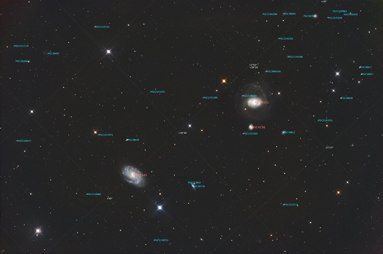 Salut, j'étais en manque d'inspiration et c'est Sam qui m'a donné l'envie de cette cible "la galaxie du cocon". Photographiées avec 30 poses de 240Sec soit 2H tout pile d'integraztion, ma version de ces galaxies: je trouve que les extensions ressortent mieux que sur l'image de Sam, peut être aurait il dû tirer un peu plus sur l'histo. La version annotée ou on voit pas mal de mon Le crop de 4151: et celui de 4145: A vos commentaires... Et si vous avez des idées de cibles pour ce soir? a+ Serge Citer Éditer1 point