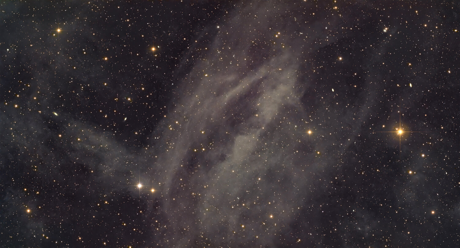A 2m de focale avec le correcteur/réducteur de Starizona, elle rentre à peine dans le cadre de la ZWO ASI533 et son petit capteur carré. Il y a pas mal de différence - et de difficultés - entre le réducteur standard de Celestron donnant une focale de 1.7m et celui-ci. Meilleure qualité certes, bien qu'un peu de chromatisme soit toujours visible, mais bien plus exigeant. Pour une fois j'ai utilisé le script de Siril pour le pré-traitement, sans tri des brutes. J'ai donc tout gardé ce qui m'a permis de cumuler 9h de pose sur 2 nuits. Ca facilite indubitablement le traitement, qui était très plaisant à réaliser, sans prise de tête! Comme souvent j’ai fait une 1re version, laissé repoer, puis rebelotte avec moins d'agressivité. LA 1re version était trop "dure". Bref, voici les données, et le résultat: 5 et 6 mars 2025 186x180" = 9h18 Celestron C11, réd/corr Starizona; F=2057mm (f/7.4) ZWO ASI 533MCPro, Asiair, filtre Antlia tri-band, OAG avec ASI 220mini Monture AZEQ6 1ere gén. Siril, SetiAstro0 point