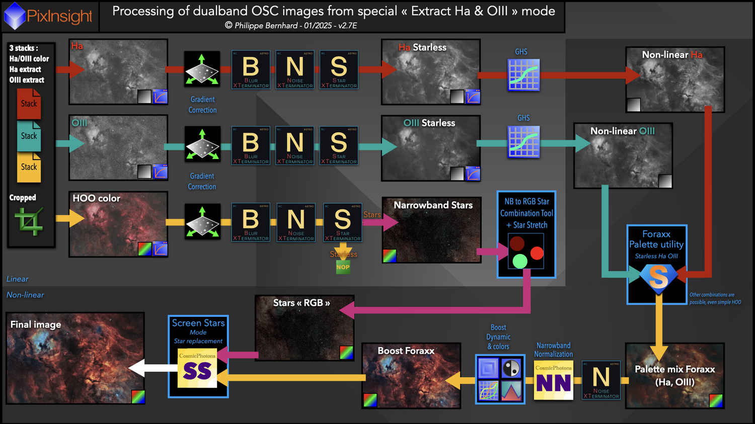 Ton workflow est probablement allégeable un petit peu. Je reste tout le temps sous Pix sauf très rares contraintes (une merdouille que je n'arrive pas à retirer correctement par exemple, passage sous Affinity Photo pour moi) parce qu'en passant sous un logiciel de traitement d'images type PS ou autre, tu es obligé de passer en 16 bits. A mon avis, plus c'est tard dans le traitement, mieux c'est. @CCD1024 - Philippe Bernhard propose quelques workflows ici : https://astro-photographie.fr/traitement_pixinsight.html Celui-ci doit bien marcher sur les dentelles en passant par un pixelmath HOO plutôt que par la palette Foraxx Pour les assemblages SHO et HOO, JB Auroux met à dispo une série de pixelmath en lien dans son tuto. Une partie est utilisable avec l'extraction d'un filtre Ha/OIII d'une OSC. Le HOO1_basique est le classique des dentelles, le HOO6_complexe peut être intéressant. Même avec Free ?0 point