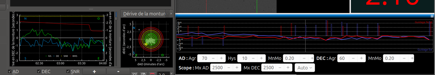 Du coup, je me suis dis, voyons voir avec phd2. Le ciel s'étant vite renfrogné, je n'ai pu le faire qu'en mode simulation. PHD2 est interfaçable avec Ekos. Gros étonnement: la courbe de phd2 et celle reportée dans Ekos, ne se ressemble pas vraiment ! Celle de PHD2 est très chouette, bien régulière, celle dans Ekos, très cahotique! Alors est-ce que PHD2 nous roule dans la farine ou est-ce Ekos ?0 point
