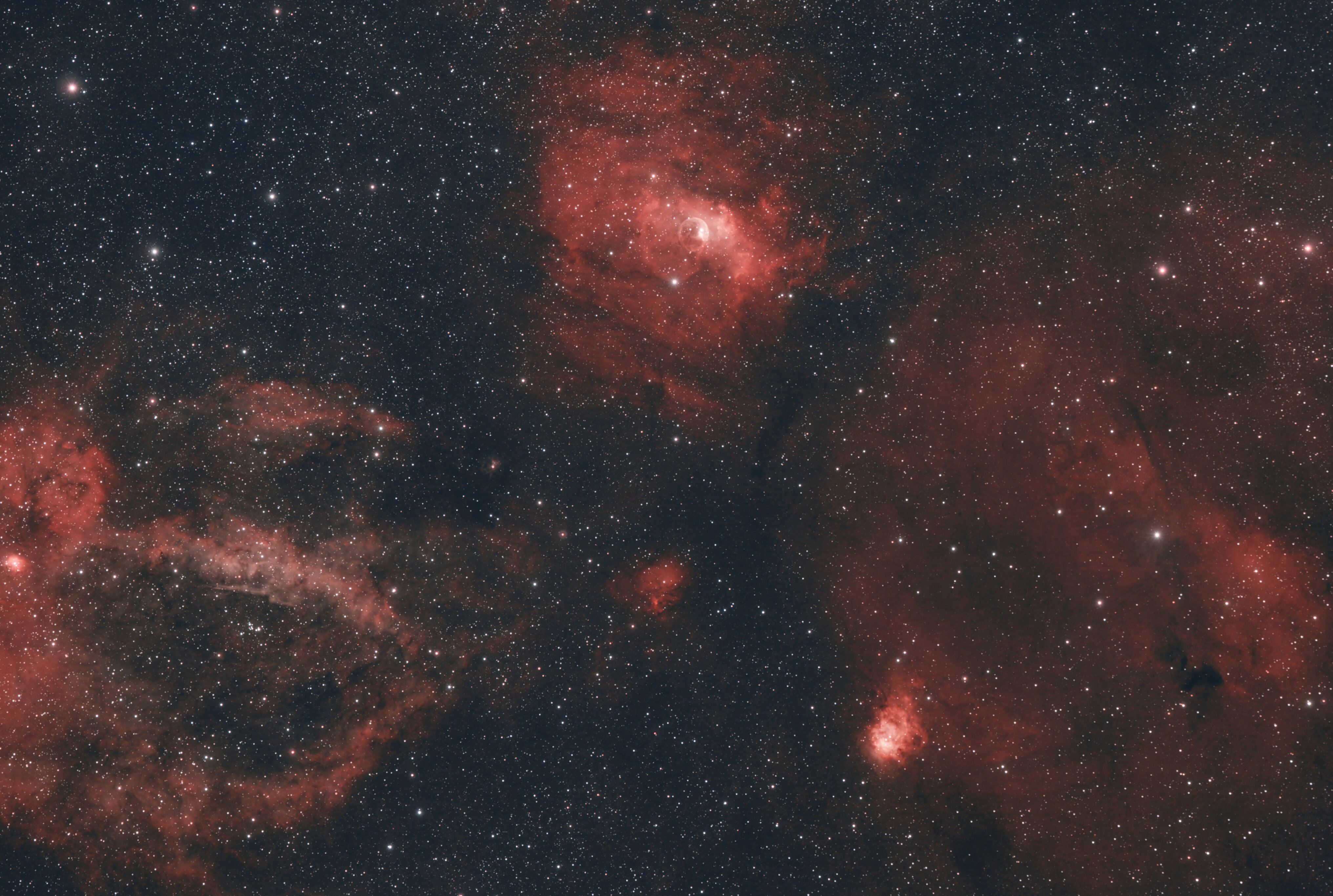 Bonjour, Première image SHO (avec étoiles RGB) du setup en remote, après d'autres en LRGB, RHαGB, HOO, etc. Étonnamment, ce n'est pas l'image que j'ai trouvé la plus simple à traiter, à cause de niveaux de signal vraiment différents entre les couches en bande étroite, et notamment la couche [OIII]. Il aurait certainement fallu poser moitié moins en Hα, et doubler le temps en [OIII]. Comme d'habitude, le traitement de Valentin (aka @valdetahiti) se trouve en fin de post Sh2-86, nébuleuse en émission dans Vulpecula Sh2-86, également connue sous le nom de NGC 6820, est une nébuleuse en émission située à environ 6 000 années-lumière de la Terre dans la constellation du Petit Renard. Découverte par l'astronome Albert Marth en 1864, cette vaste région HII est un nuage de gaz, principalement de l'hydrogène, qui est ionisé par le rayonnement intense des jeunes étoiles chaudes nichées en son sein. Comme beaucoup de nébuleuses en émission, elle est un véritable laboratoire cosmique, nous offrant un aperçu des processus de formation d'étoiles. Sa lueur rougeâtre caractéristique, bien visible en astrophotographie, provient de l'émission de l'hydrogène alpha (Hα) lorsque les électrons se recombinent avec les protons. Au cœur d'une maternité d'étoiles Au centre de Sh2-86 se trouve l'amas ouvert NGC 6823, un groupe de jeunes étoiles âgées d'à peine deux millions d'années qui sont nées du gaz de la nébuleuse. Ce sont ces étoiles, particulièrement les plus massives et les plus chaudes de type O et B, qui sculptent et illuminent le nuage environnant. La région est particulièrement riche en phénomènes liés à la naissance stellaire. On y trouve des objets de Herbig-Haro, de petits jets de gaz éjectés par des étoiles en formation qui entrent en collision avec le milieu interstellaire. De plus, Sh2-86 abrite de nombreuses agglomérations gazeuses denses et des piliers de poussière, semblables aux célèbres "Piliers de la Création", qui sont des cocons où de nouvelles étoiles continuent de se former. Ces structures denses sont souvent détectables en tant que sources infrarouges brillantes, trahissant l'activité de protoétoiles encore enfouies dans leur gangue de gaz et de poussière. Acquisition 🔭 Lunette TS-Optics CF-APO 102, avec réducteur 0.8x (F/5.6) ⚙️ Monture équatoriale Sky-Watcher EQ8-R Pro 📷 Prise de vue via ToupTek ATR2600M 🎯 Guidage via ToupTek GP CMOS 02000 KPB sur OAG 💻 Pilotage via N.I.N.A. ⌨️ Prétraitement et traitement avec PixInsight et Affinity Photo 📅 Du 17 juin au 17 juillet 2025 🌍 Setup en remote, chez Roboscopes en Espagne Brutes : Hα : 96 x 300" [OIII] : 96 x 300" [SII] : 96 x 300" RGB : 3 x 40 x 180" Intégration : 30 heures DOF : Darks : 101 Flats : 15 Bias : 201 Lien vers la full : https://app.astrobin.com/i/khgobf Version starless : Crop sur la zone central et NGC 6823 : Version annotée : Tout ce monde ce situe ici : Le traitement de Valentin se trouve ici :6 points