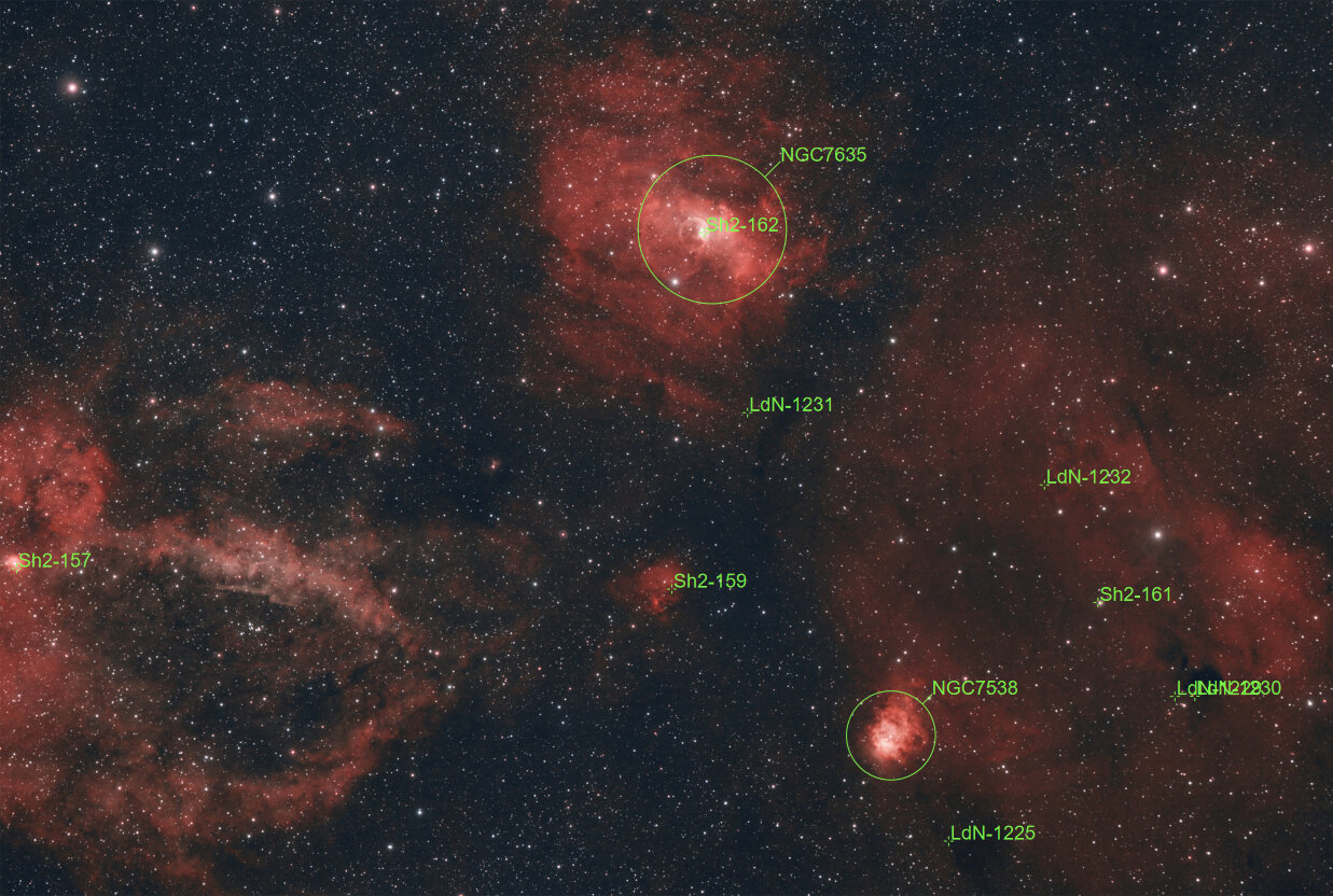 Bonjour à tous Voici un beau petit bout du ciel dans la constellation de Céphée. Sh2-140 est une nébuleuse en émission HII située à la limite sud-ouest de la nébuleuse de Lynds 1204. Elle fait partie de la grande région de formation d'étoiles du complexe de Céphée. 512 poses de 180s avec un filtre player anti halo UV/IR cut. caméra Asi 2600 air Takahashi Epsilon 130 monture ioptron GEM 45 siril,pixinsight,photoshop Bortle 6 https://app.astrobin.com/u/laup1234?i=8kn1zw#gallery1 point