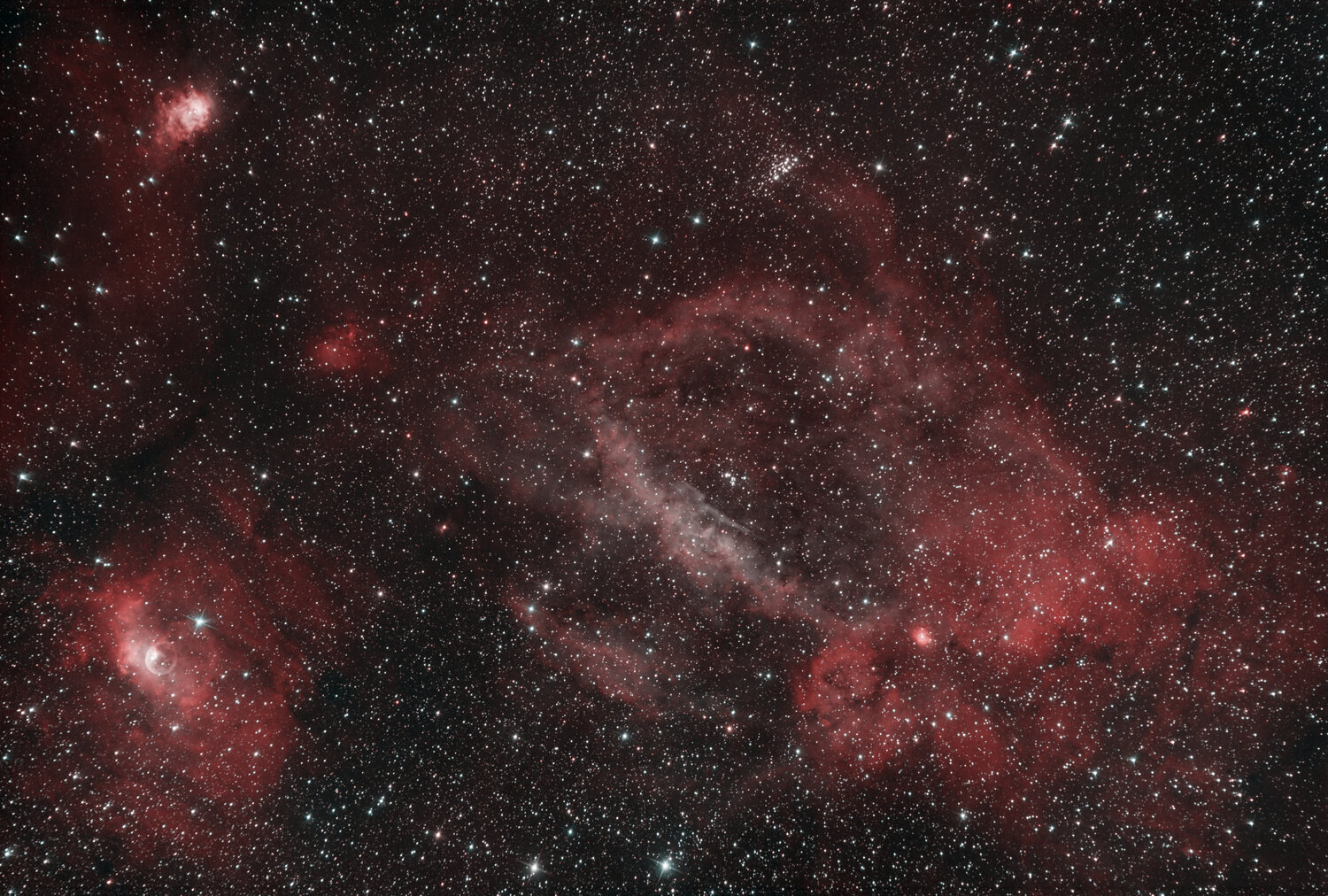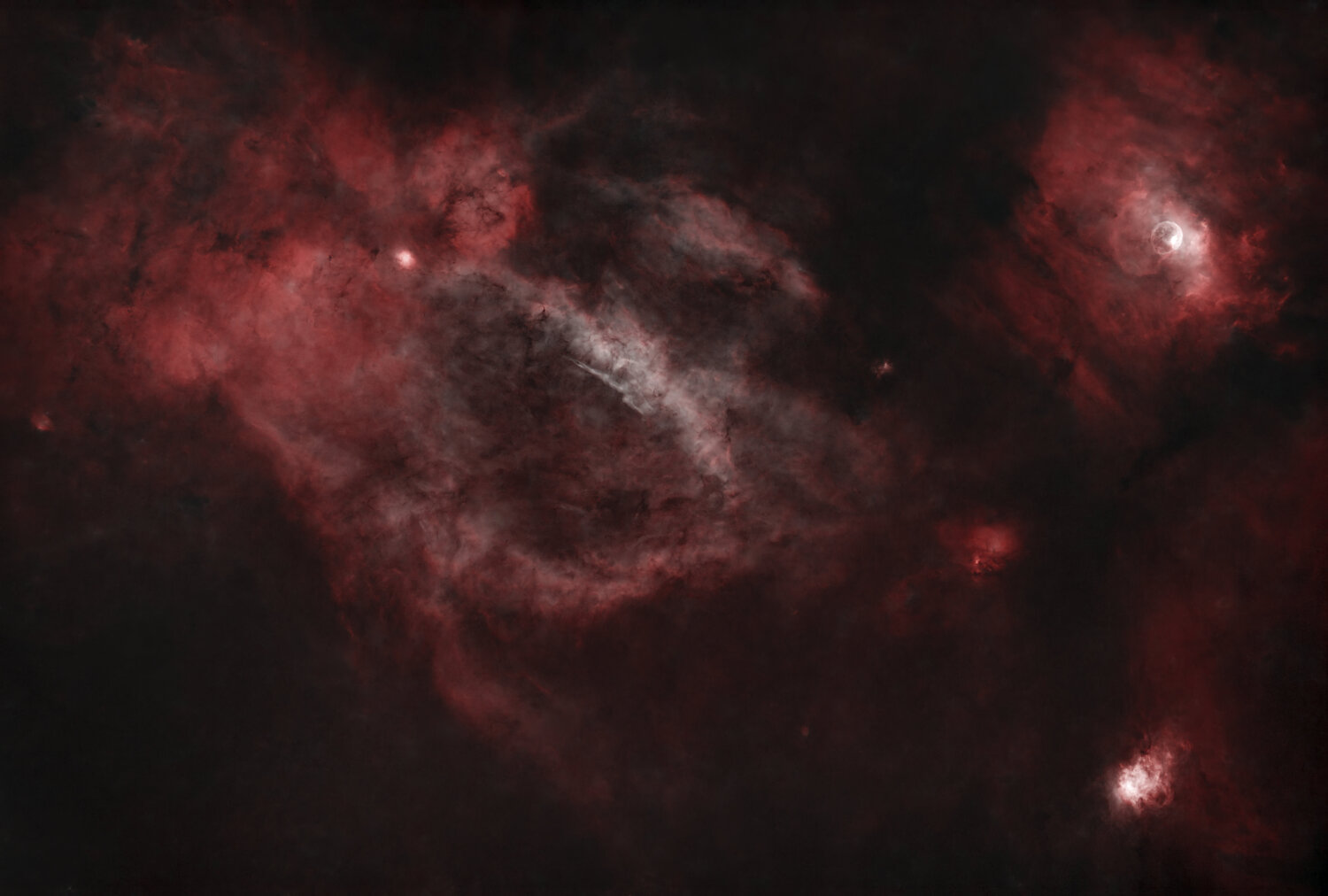 Salut les amis 😊, Déjà vu plusieurs fois sur le fofo ces derniers temps, mais pas en SHO (de mémoire). J'ai surtout été bluffé par le post de @180Vision et sa splendide prise de vue de cette trompe de l'espace, ça ma titillé d'essayer de m'en approcher, mais le constat est clair : impossible 😅 ahah... Prise de vue avec la 103apo et ma 533MMpro, je me demande d'ailleurs si je ne me laisserai pas tenté par une 585MMpro prochainement pour gagner en résolution (théorique), mais à priori celle de chez Zwo n'a pas trop bonne presse, si quelqu'un ici l'utilise et peut faire un petit feedback. J'y ai passé 4 nuits au total : Ha = 170*180s SII = 120*180s OIII = 120*180s °°°°°°°°°°°°°°° EDIT du 03/09/25 °°°°°°°°°°°°°°°°° Bon, après avoir revu ce premier post je me suis quand même demandé quelle substance illicite j'avais bien pu prendre lors du traitement : trop contrasté, trop coloré, bref je n'en suis pas du tout satisfait. Comme il fait moche et que je suis cloué à la baraque pour cause de covid, j'me suis relancé dans le traitement. Voilà le résultat :0 point