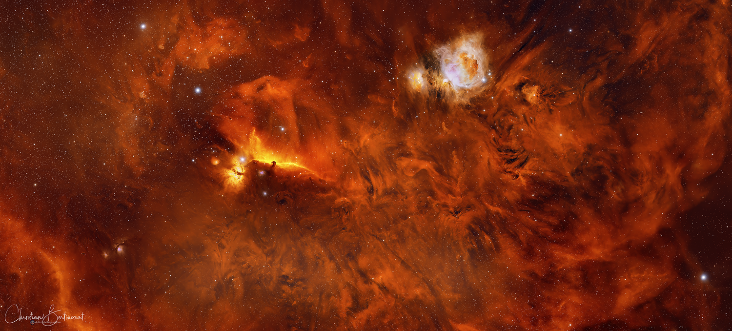 "Les voiles de feu d'Orion" Sous les cieux de l’hiver, la ceinture d’Orion dévoile un spectacle grandiose. Entre brumes cosmiques et nébuleuses flamboyantes, cette fresque révèle l’incandescence d’un univers en perpétuel mouvement. Cette fresque composée de 6 panneaux en Hoo-RGB à nécessité le traitement de 24 tuiles au total pour une résolution de 26813x11500 soit 308Mpx En espérant que le résultat vous plaise 🙏 : Filtre Antlia ALP-T Ha/OIII, Ultra RVB : Mosaïque de 6 tuiles de 42x180s + 40x60s : ZWO Asiair Plus : Askar FRA600 f/3.9 : ZWO ASI6200Mc Pro à -10° : iOptron GEM45 : Siril - PixInsight - Photoshop : Col de la Chau (Drôme) / St Martin en Haut (69) : Bortle 3 et 4.5 : 05,06,14 et 17/02/25 La version full https://flic.kr/p/2qMJ4AK19 points
