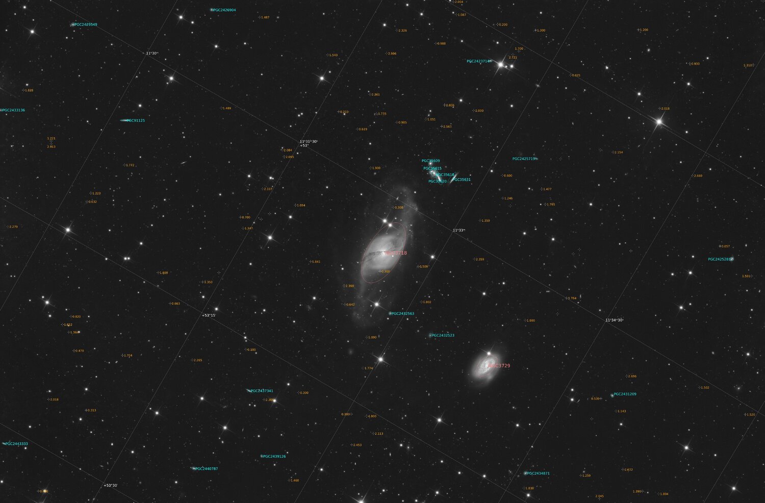 Salut, Voici la dernière image de cette lunaison avec le T200 Zen, avant que le T250 reprenne du service à la prochaine nouvelle lune. La magnifique galaxie spirale barrée NGC3718, à environ 57 millions d'a.l. dans la Grande Ourse, possède une forme très caractéristique, due à son interaction gravitationnelle avec la spirale NGC3729 à proximité. Le groupe compact Hickson 56 situé en arrière-plan, à environ 420 millions d'a.l., donne à l'ensemble beaucoup de relief. Il s'agit d'un de mes champs préférés du ciel sur lequel je reviens presque tous les ans. Sa faible luminosité surfacique le rend difficile depuis ma banlieue à 20km du périphérique parisien. La nuit de mercredi à jeudi fut relativement bonne malgré la lune, bonne transparence et turbulence raisonnable. J'ai pu faire 370*60sec de luminance et 40*60sec par filtre RVB, que j'ai pu combiner avec 356*60sec de luminance prises en 2023 dans des conditions comparables. L'image finale est obtenue à partir de 12h de luminance, avec une FWHM médiane de 1,97" et une magnitude limite de 21,7 d'après astap, et 40min par couche couleur. Je ne suis pas très satisfait de la colorimétrie, j'attendais plus de bleu et moins de vert dans la galaxie alors que j'utilise exactement le même process que d'habitude avec SPCC en particulier (ce dernier d'ailleurs semble curieusement sensibles aux étapes antérieures comme le calage des histogrammes ou la méthode de retrait de gradient). Voici donc l'image totale (clic droit pour la pleine résolution) : Une version recadrée : Et enfin la luminance annotée : e vous laisse trouver le quasar de redshift z=4,8 (WISEA J113309.46+5315307), de magnitude m_R = 21,8 et m_B = 22,51. Sa lumière a été émise il y a 12,4 milliards d'années ! Bon week-end, Dan Détails techniques : Astrographe 200/800 carbone optiques Zen + Wynne 2.5" sur AP900 ASI183mm, guidage OAG + ASI120MM, ASIAIRv1 Luminance 720*60sec à gain 110, -10 °C Chrominance 40*60sec à gain 110, -10 °C par couche RVB Conditions de turbulence correctes (FWHM de 1,97" après empilement), pollution lumineuse d'IdF à 20km de Paris. Empilement Siril, traitement PI et Rawtherapee19 points