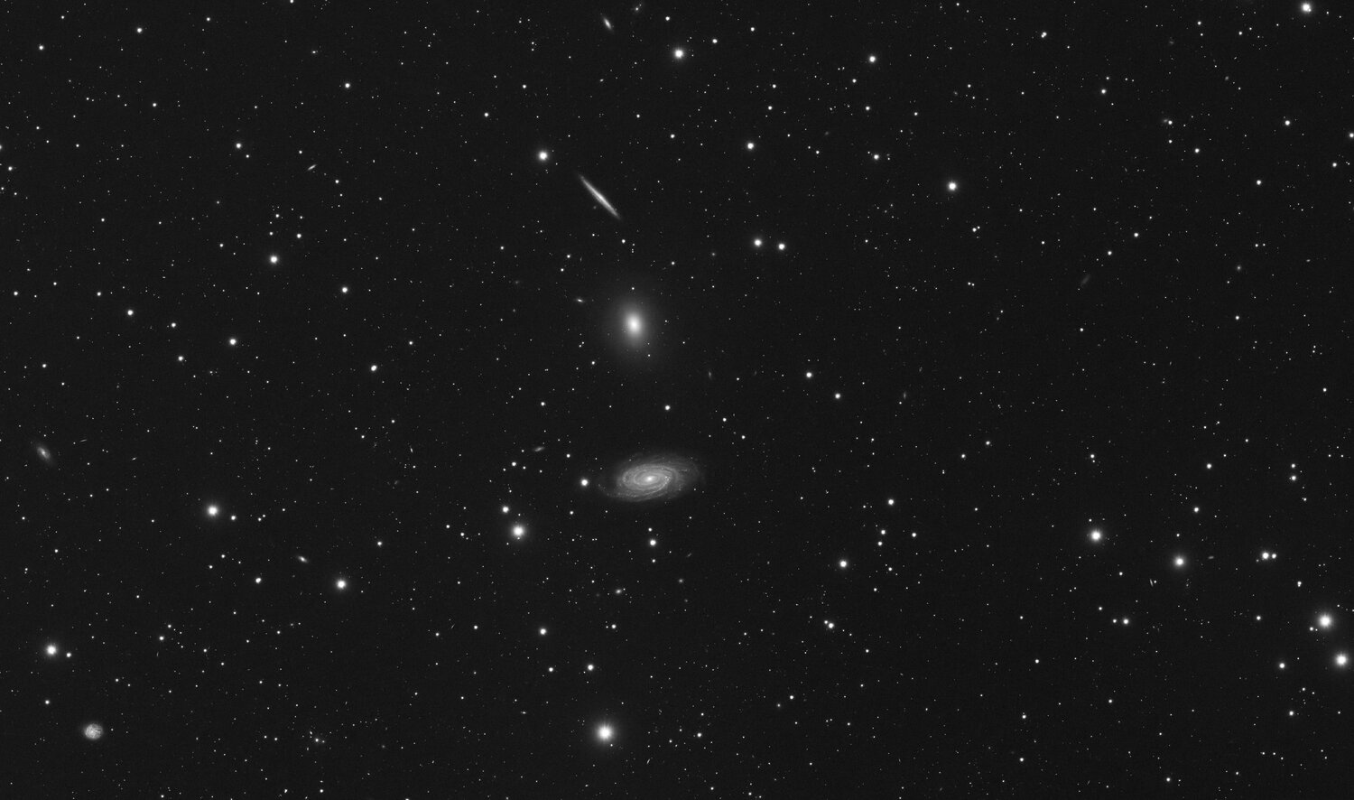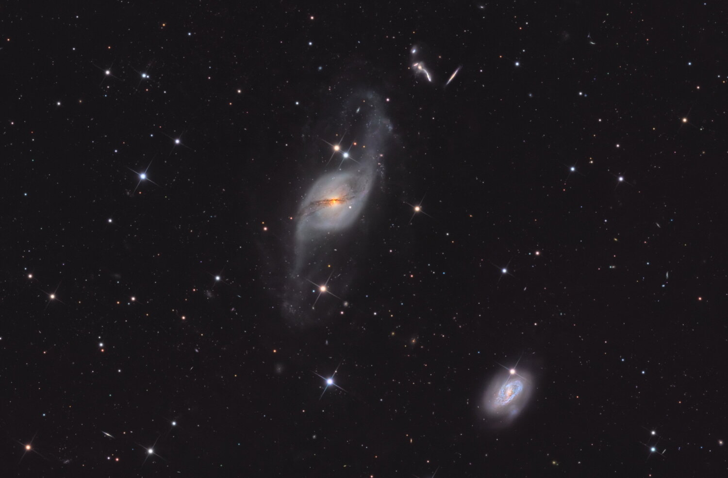 Salut tout le monde, je suis parti avec mes potes habituels pour 10 jours en Creuse, dans le même gîte que l'an dernier. Ce séjour m'a permis de tester enfin la TOA150 échangée cet hiver contre mon APM130 (petit coucou à son nouveau papa !). Avec cet instrument l'idée c'est d'atteindre un échantillonnage de 0.70" pour des galaxies moyennes à faibles. La TOA150 est donnée pour une résolution de 3µ au centre du champ et 5µ au bord d'un 24x36 (avec le correcteur FL67), ça matche assez bien avec les pixels de l'ASI2600 mono. Les conditions météo ont été soit parfaites (seeing 1.59" et SQM 21.88) soit désastreuses, avec au total 4 nuits exploitables sur les 10, et beaucoup de pluie et d'orages violents. Matériel : TOA150 + correcteur FL67, ASI2600MM à -10°C + EFW et filtres 36mm ZWO, OAG-L + ASI174, monture EM400 Temma2, ASiair Plus Pour toutes les images, retrait de DOF, traitement SiriL, BlurX + NoiseX sous Pix et finition CS5. - NGC 3718 dans la grande Ourse, la meilleure nuit, avec un seeing entre 1.59" et 1.8" pour les plus mauvaises, mais une humidité infernale due à 2 jours de pluie ininterrompue. 5 heures de pose avec des subs de 180s en L. J'ai également des couches RVB pour cet objet mais pour le moment le résultat ne me satisfait pas. On devine une myriade de galaxies dans le fond de ciel. Cliquez dans l'image pour la full. - Le trio du Dragon, NGC5981 + NGC5982 + NGC5985, avec là encore un très bon seeing mais toujours une humidité importante. 3 heures de pose en subs de 180s. Pour cette image comme pour celle de 3718, on voit que les étoiles ont un défaut (aigrette sombre). Après contact avec Riton, j'ai un peu desserré les anneaux et le correcteur et je n'ai plus retrouvé le défaut sur les images du reste de la semaine. Cliquez dans l'image pour la full. - Le classique trio du Lion, M65 + M66 + NGC3628, seeing nettement moins bon et présence de la Lune pas très loin. 2 heures de pose en subs de 120s. Cliquez dans l'image pour la full. - NGC3344 dans le petit Lion, seeing moyen entre 1.8" et 2.4", présence de la Lune pas très loin. Je suis assez content des détails qui apparaissent pour une galaxie de taille modeste, ça augure du bon pour la suite. 2 heures de pose en subs de 120s. Cliquez dans l'image pour la full.19 points