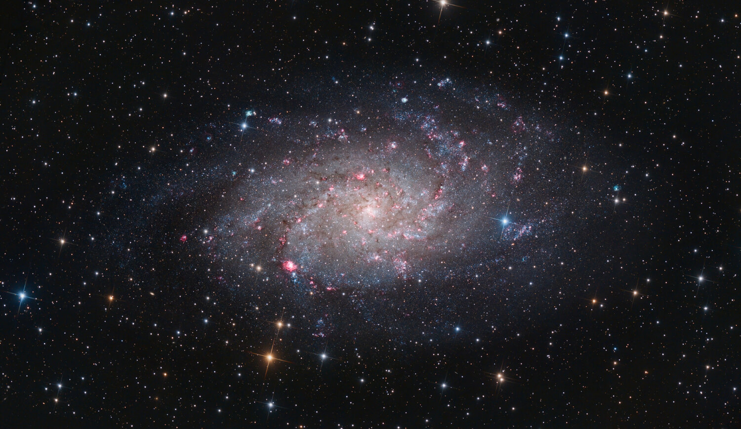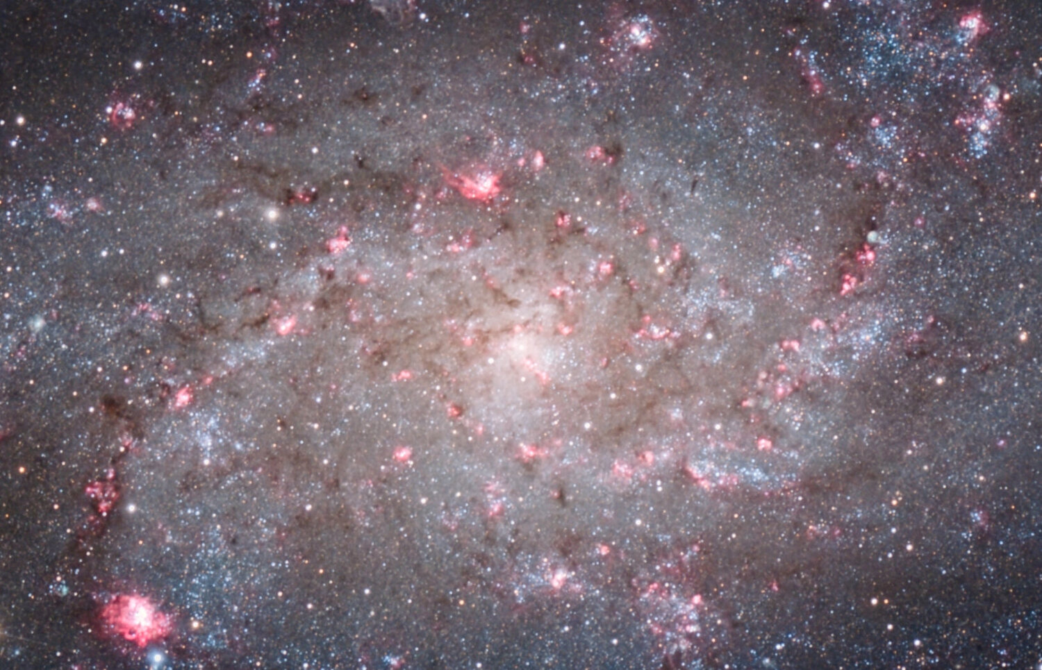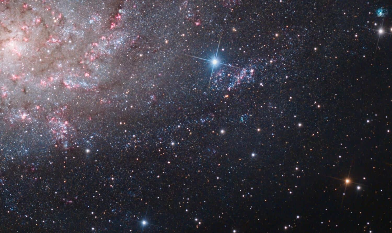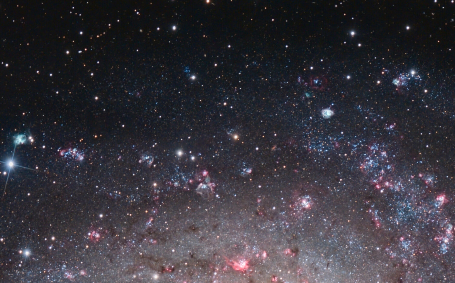 Fini pour M33 cette saison, elle reviendra en Septembre. Elle est trop basse maintenant pour ajouter du temps. J'ai passer 4 nuits partielle dessus en Octobre Nov. et Décembre, avec retenus: 5h en RGB et 2,5h en Ha/OIII sur la 2600MC Avec le 200/800, ca donne un échantillonnage juste a 1". J'ai pousser le contraste car cette galaxie a tendance a apparaitre dans un nuage de brume, avec un hallo de poussières important autour qui donne des images tres grise ou uniforme. Et j'ai pousser les couleurs aussi. Siril + Graxpert + Gimp. Au final ca donne des bras relativement bien résolus en étoiles, et des nebuleuses juste partout !!! Quelque extrait puis la photo globale: Bras exterieurs tres etoilés avec des nebuleuses en pagaille, des Ha et des nébuleuses OIII en vert/blanc. Un bras vers l'exterieur resolu en etoiles. Le centre ! Bourré de Ha.17 points