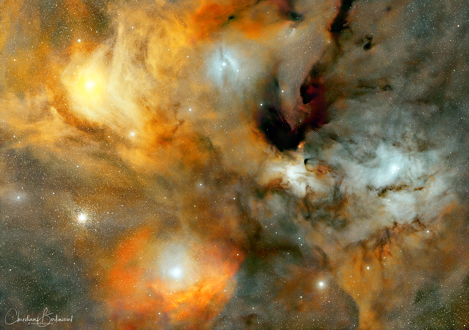 Bonjour, Aujourd'hui, ma Mosaique de l'été, faite en 3 mois avec 6 panneaux, Mais pas planifiée des le départ, donc les panneaux sont pas du tout alignés ! La particularité c'est qu'elle est en partie sur la voie lactée, ce qui donne 2 zone tres differentes: - Zones dans la voie lactée, bourrée de Ha assez fort, - Zone en dehors de la voie lactée, remplie de poussieres et tres peu de Ha Ce qui m'a obliger a faire une double image d'une partie des panneaux: une en filtres bande étroite, et une en RGB. Donc on a ici entre 3 et 6h par panneau, avec souvent un mix délicat (car tres different d'un panneau a l'autre) des 2 images. Tous a été fait sur le samyang 135mm F2. Mosaique faite a la mains sur GIMP ! En plus de tous les Objet listé en titre, il y a aussi des zone que je connaissais pas bien, ou des objet proche qu'on ne voit pas enssemble d'habitude: Quelques Extrait de zone interessante: La cave, la bulle et la pince de homard, avec au milieu la lagune du nord: Vous remarquerez que tous ces objet sont en fait lié par un mélange de Ha et nebuleuses sombres: Le lion avec ses voisine mois connu, Beaucoup de Ha et de nébuleuses sombres. Le pont entre la trompe et la chauve souris, avec le Calmar et une nébuleuse en réflection, visible que sur le RGB, a coté du pont: Le Fantome, Iris et les grand nuages de poussieres a droite: (en fait il y en a partout, mais ceux de droite sont plus contrastés, et plus connus. et voici la mosaique ! Attention, c'est un patchwork !23 points