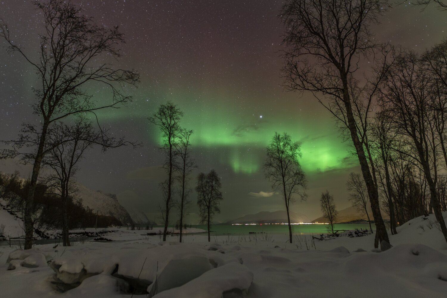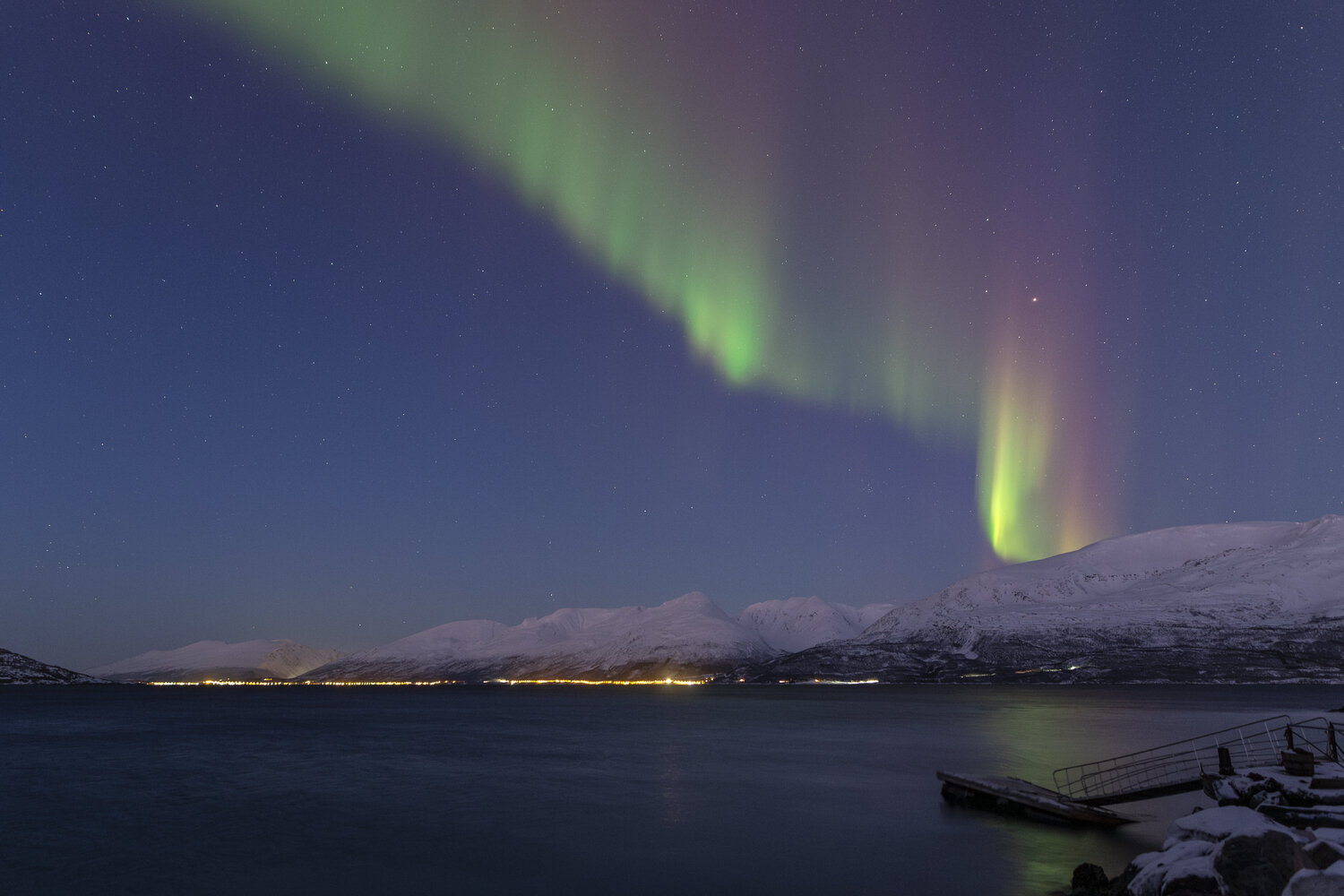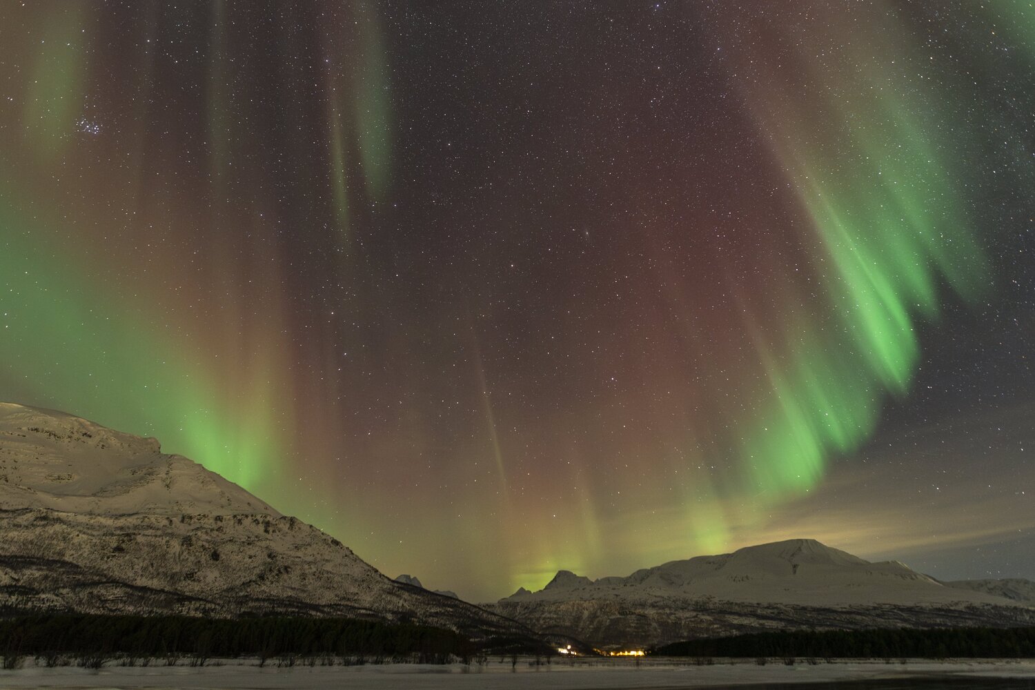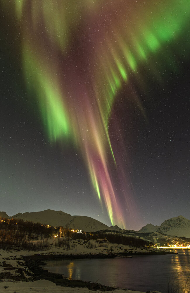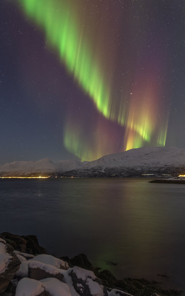 Salut à tous, Me revoilà après une longue pose. Un problème de connexion à mon compte m'a empêché de l'utiliser et donc de poster. Je suivais les posts en mode camouflage 😄. J'avais presque laissé tombé l'idée de récupérer mon compte mais j'ai pu relancer un modérateur via un nouveau profil et il a pu débloquer la situation. (il ne fait pas bon avoir une adresse mail outlook 😉). Pas mal d'images en retard à vous montrer! Je vais commencer par un retour concernant le voyage que j'ai effectué en Norvège fin janvier dernier pour chasser les aurores boréales. Il s'agit de mon 2ème voyage après celui en Suède l'année précédente. (quand on y a goûté🤩) Je pars avec 3 collègues du club astro (le GAAC) . Pour maximiser le ‘‘temps d’aurores’’ potentiel, nous partons un peu plus tôt dans l’année, un peu plus au Nord, et un peu plus longtemps qu'en Suède (10j). Départ le 24 janvier au matin. Après une première partie de voyage un peu stressante entre Lille et Paris Charles-de-Gaulle (mon tgv à Lille ayant été annulé!), nous décollons pour Tromso avec une arrivée prévue dans le milieu de l'après midi. Nous n'avons pas prévu de rester sur Tromso car c'est une ville avec une forte pollution lumineuse. Le voyage se divisera en 2 parties: un premier séjour vers Koppangen et le second à Skibotn: Le 1er gite réservé est situé à 2h30 de voiture de Tromso. La route est longue… Un dernier effort sur une chaussée glacée qui serpente au bord du fjord et nous arrivons, près du port de Koppangen. À peine sortis de la voiture et les phares éteints, une arche aurorale nous saute aux yeux ! Les valises sont déchargées à la hâte et quelques minutes plus tard, nous sommes prêts! Après quelques photos rapides qui servent à nous remettre dans le bain, nous constatons bien vite que sommes gênés par les lampadaires environnants, y compris ceux de notre location que nous avons du mal à éteindre. D’une manière générale, les norvégiens sont peu enclins à conserver la noirceur du ciel, tout est très éclairé, les routes, les bâtiments, les maisons, jusqu’à la moindre cabane... Peut-être est ce pour conjurer l’obscurité quasi permanente de cette période de l’année ? Nous n’aurons pas la qualité de ciel nocturne d’Abisko et il faudra s’en contenter. Sans avoir pu faire de repérage en plein jour, nous partons chercher l’obscurité… À proximité de notre chalet, un chemin mène vers le bord de mer en contrebas où nous avons repéré une plage sur les cartes satellites. L’arche aurorale semble émerger d’un haut sommet montagneux, comme un volcan en pleine éruption: Soudain, la partie inférieure de l’arche s’agite et ondule. Quel début de séjour ! L'activité se calme. Nous en profitons pour rentrer et nous installer. Un repas est vite avalé alors que le ciel s'embrase de nouveau: L'activité se calme peu à peu. Il est temps de rentrer et de se coucher. Cela fait plus de 20h que nous sommes debout! Le temps en Norvège s'est dégradé. Après une seconde nuit à espérer une trouée et deux tentatives de sorties infructueuses, nous espérerons que le ciel va enfin se dégager pour cette 3ème nuit . Je décide de m'installer à côté d'une rivière que nous avons repéré en journée à coté du logement. Les nuages se disloquent enfin. L'activité aurorale n'est pas forte mais on retrouve de belles ondulations et de délicats piliers qui font penser à des rideaux de pluie: Durant la soirée, des voiles arrivent et coïncident avec la baisse de l'activité. Nous rentrons, heureux d'avoir pu voir à nouveau ce spectacle. 4ème jour : Le temps est dégagé. Il est à peine 15h30 mais Jupiter et vénus sont déjà visibles . Le ciel parait encore clair mais le groupe souhaite quand même sortir rapidement. Nous prenons la voiture car nous avons repéré un spot photo juste à côté de la distillerie « Bivrost » qui est la plus septentrionale au monde. Il n’y a qu’un petit quart d’heure de route mais l’excitation monte d’autant que l’aurore est déjà bien visible malgré la clarté du ciel. Arrivés sur site, il n’y a plus aucun doute, c’est le feu ! Le phénomène, au crépuscule, est vraiment magique ! Il est à peine 17h30 mais l'heure bleue a laissé place à la nuit noire. Nous décidons de remonter en voiture et de laisser la distillerie pour un chemin en forêt. L’ensemble du ciel est baigné d’une lueur verdâtre. C’est sûrement le résidu de l’intense activité que nous avons vu plus tôt en bord de mer. Le ciel tend à se voiler, l’aurore se calme également. Avant de rentrer, nous faisons une dernière halte au port de Koppangen. Là bas, la pollution lumineuse est forte et les lampadaires nous contraignent à un seul point de vue : un bateau amarré au milieu de la baie. Dernière nuit sur le lieu du 1er gîte avant de partir pour Skibotn. Pour l’instant, le ciel est couvert sur toute la Scandinavie. Des éclaircies sont annoncées un peu plus tard. Les caméras en Alaska montrent un activité aurorale forte. Dans la soirée, les touées apparaissent et coïncident avec une diminution de l'activité. Nous aurons quand même droit à un chouette spectacle. Nous arrivons sur Skibotn en début d'après-midi sous un ciel clair. Les prévisions météo pour la fin du séjour ne sont pas bonnes donc il faut profiter de la dernière soirée. Nous sortons en fin d'après midi mais les aurores se font attendre. Un peu dépitée, l’équipe se résigne à rentrer. A peine installé au chalet, je décide de jeter un œil dehors et c'est le feu ! Nous courrons vers le fond du camping en espérant trouver un endroit sans trop de lumières. Nous n’avions pas eu le temps de repérer le coin et, fort heureusement, le lieu est assez isolé pour profiter pleinement du spectacle ! Images réalisées au canon 6d astrodon/ tt artisan 11 mm/ irix 15mm/ sigma art 20mm. Bon c