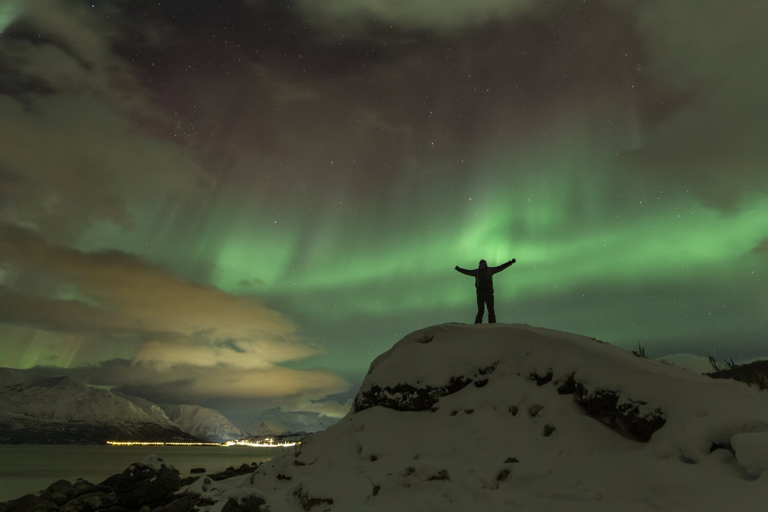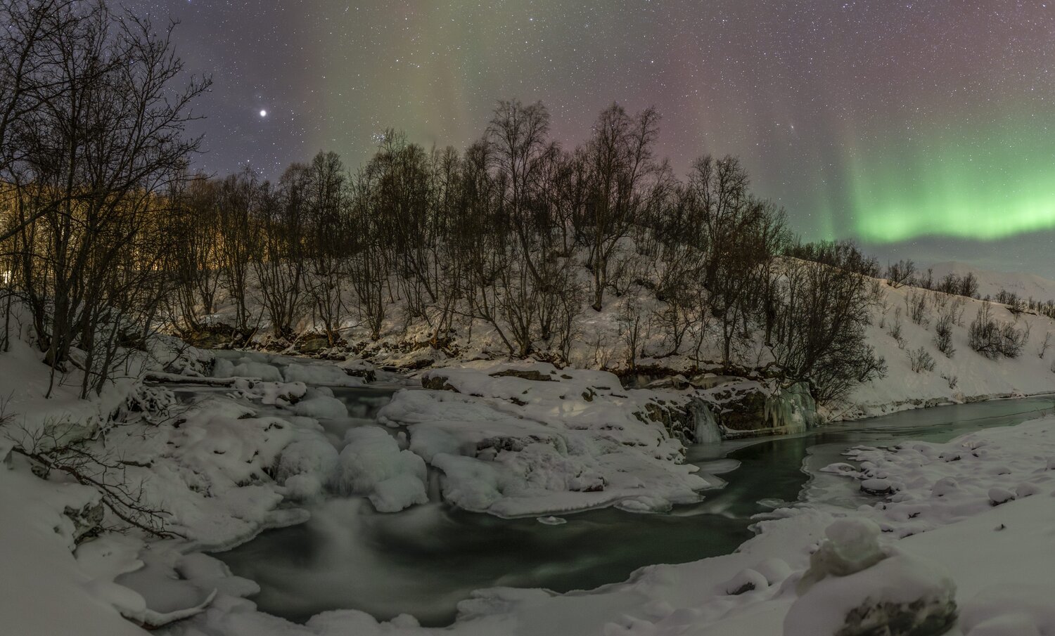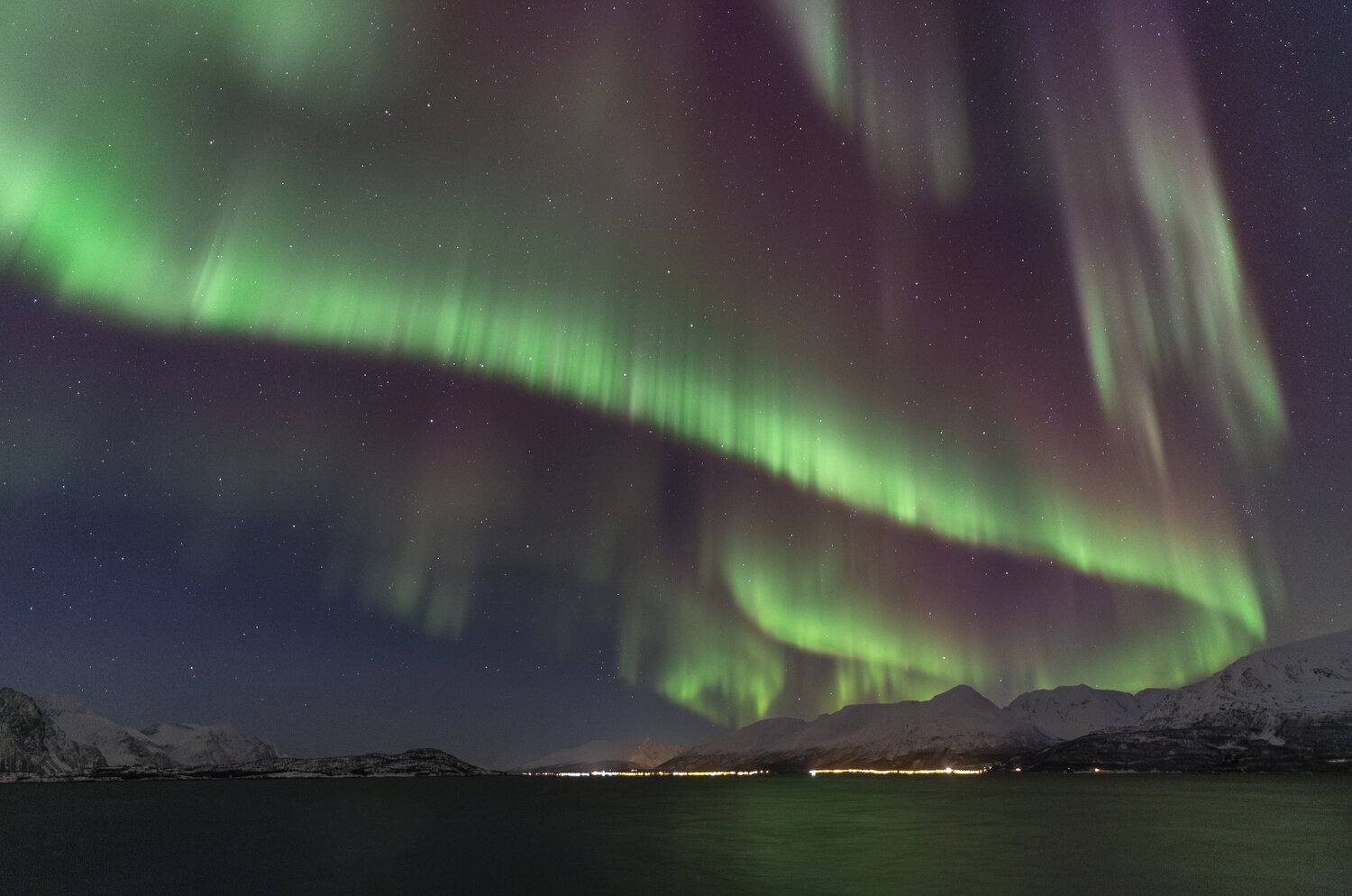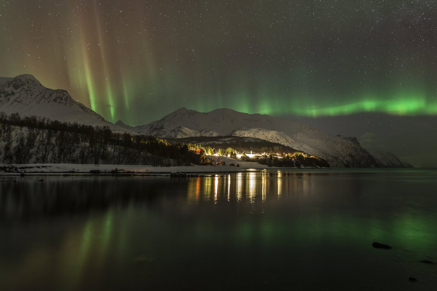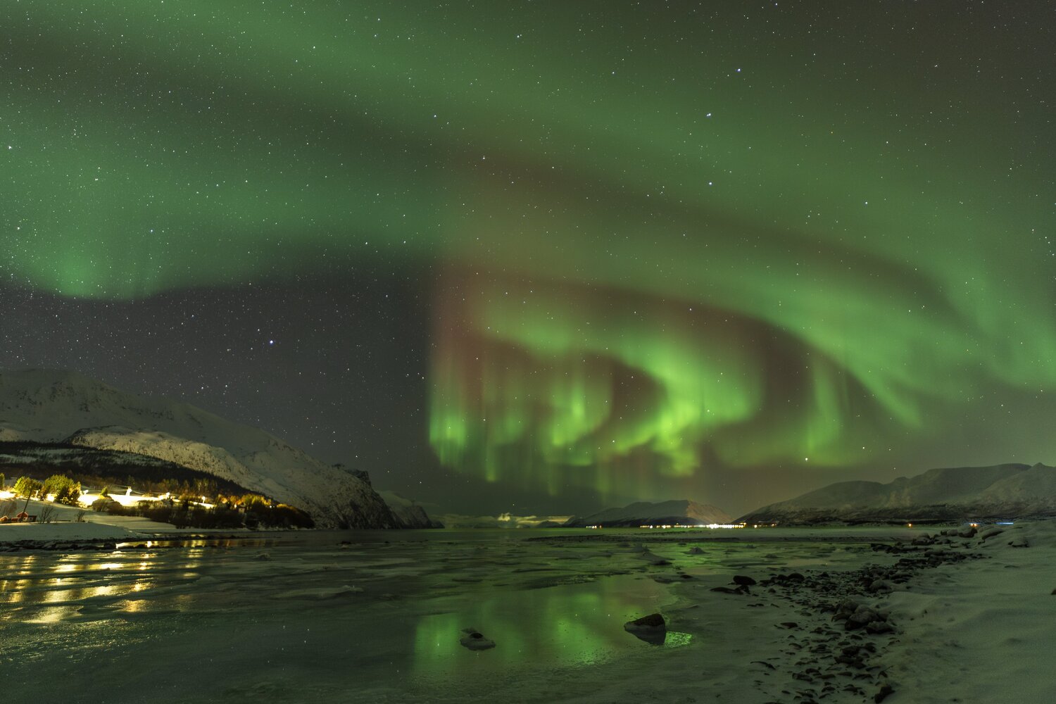 Salut à tous, Me revoilà après une longue pose. Un problème de connexion à mon compte m'a empêché de l'utiliser et donc de poster. Je suivais les posts en mode camouflage 😄. J'avais presque laissé tombé l'idée de récupérer mon compte mais j'ai pu relancer un modérateur via un nouveau profil et il a pu débloquer la situation. (il ne fait pas bon avoir une adresse mail outlook 😉). Pas mal d'images en retard à vous montrer! Je vais commencer par un retour concernant le voyage que j'ai effectué en Norvège fin janvier dernier pour chasser les aurores boréales. Il s'agit de mon 2ème voyage après celui en Suède l'année précédente. (quand on y a goûté🤩) Je pars avec 3 collègues du club astro (le GAAC) . Pour maximiser le ‘‘temps d’aurores’’ potentiel, nous partons un peu plus tôt dans l’année, un peu plus au Nord, et un peu plus longtemps qu'en Suède (10j). Départ le 24 janvier au matin. Après une première partie de voyage un peu stressante entre Lille et Paris Charles-de-Gaulle (mon tgv à Lille ayant été annulé!), nous décollons pour Tromso avec une arrivée prévue dans le milieu de l'après midi. Nous n'avons pas prévu de rester sur Tromso car c'est une ville avec une forte pollution lumineuse. Le voyage se divisera en 2 parties: un premier séjour vers Koppangen et le second à Skibotn: Le 1er gite réservé est situé à 2h30 de voiture de Tromso. La route est longue… Un dernier effort sur une chaussée glacée qui serpente au bord du fjord et nous arrivons, près du port de Koppangen. À peine sortis de la voiture et les phares éteints, une arche aurorale nous saute aux yeux ! Les valises sont déchargées à la hâte et quelques minutes plus tard, nous sommes prêts! Après quelques photos rapides qui servent à nous remettre dans le bain, nous constatons bien vite que sommes gênés par les lampadaires environnants, y compris ceux de notre location que nous avons du mal à éteindre. D’une manière générale, les norvégiens sont peu enclins à conserver la noirceur du ciel, tout est très éclairé, les routes, les bâtiments, les maisons, jusqu’à la moindre cabane... Peut-être est ce pour conjurer l’obscurité quasi permanente de cette période de l’année ? Nous n’aurons pas la qualité de ciel nocturne d’Abisko et il faudra s’en contenter. Sans avoir pu faire de repérage en plein jour, nous partons chercher l’obscurité… À proximité de notre chalet, un chemin mène vers le bord de mer en contrebas où nous avons repéré une plage sur les cartes satellites. L’arche aurorale semble émerger d’un haut sommet montagneux, comme un volcan en pleine éruption: Soudain, la partie inférieure de l’arche s’agite et ondule. Quel début de séjour ! L'activité se calme. Nous en profitons pour rentrer et nous installer. Un repas est vite avalé alors que le ciel s'embrase de nouveau: L'activité se calme peu à peu. Il est temps de rentrer et de se coucher. Cela fait plus de 20h que nous sommes debout! Le temps en Norvège s'est dégradé. Après une seconde nuit à espérer une trouée et deux tentatives de sorties infructueuses, nous espérerons que le ciel va enfin se dégager pour cette 3ème nuit . Je décide de m'installer à côté d'une rivière que nous avons repéré en journée à coté du logement. Les nuages se disloquent enfin. L'activité aurorale n'est pas forte mais on retrouve de belles ondulations et de délicats piliers qui font penser à des rideaux de pluie: Durant la soirée, des voiles arrivent et coïncident avec la baisse de l'activité. Nous rentrons, heureux d'avoir pu voir à nouveau ce spectacle. 4ème jour : Le temps est dégagé. Il est à peine 15h30 mais Jupiter et vénus sont déjà visibles . Le ciel parait encore clair mais le groupe souhaite quand même sortir rapidement. Nous prenons la voiture car nous avons repéré un spot photo juste à côté de la distillerie « Bivrost » qui est la plus septentrionale au monde. Il n’y a qu’un petit quart d’heure de route mais l’excitation monte d’autant que l’aurore est déjà bien visible malgré la clarté du ciel. Arrivés sur site, il n’y a plus aucun doute, c’est le feu ! Le phénomène, au crépuscule, est vraiment magique ! Il est à peine 17h30 mais l'heure bleue a laissé place à la nuit noire. Nous décidons de remonter en voiture et de laisser la distillerie pour un chemin en forêt. L’ensemble du ciel est baigné d’une lueur verdâtre. C’est sûrement le résidu de l’intense activité que nous avons vu plus tôt en bord de mer. Le ciel tend à se voiler, l’aurore se calme également. Avant de rentrer, nous faisons une dernière halte au port de Koppangen. Là bas, la pollution lumineuse est forte et les lampadaires nous contraignent à un seul point de vue : un bateau amarré au milieu de la baie. Dernière nuit sur le lieu du 1er gîte avant de partir pour Skibotn. Pour l’instant, le ciel est couvert sur toute la Scandinavie. Des éclaircies sont annoncées un peu plus tard. Les caméras en Alaska montrent un activité aurorale forte. Dans la soirée, les touées apparaissent et coïncident avec une diminution de l'activité. Nous aurons quand même droit à un chouette spectacle. Nous arrivons sur Skibotn en début d'après-midi sous un ciel clair. Les prévisions météo pour la fin du séjour ne sont pas bonnes donc il faut profiter de la dernière soirée. Nous sortons en fin d'après midi mais les aurores se font attendre. Un peu dépitée, l’équipe se résigne à rentrer. A peine installé au chalet, je décide de jeter un œil dehors et c'est le feu ! Nous courrons vers le fond du camping en espérant trouver un endroit sans trop de lumières. Nous n’avions pas eu le temps de repérer le coin et, fort heureusement, le lieu est assez isolé pour profiter pleinement du spectacle ! Images réalisées au canon 6d astrodon/ tt artisan 11 mm/ irix 15mm/ sigma art 20mm. Bon c