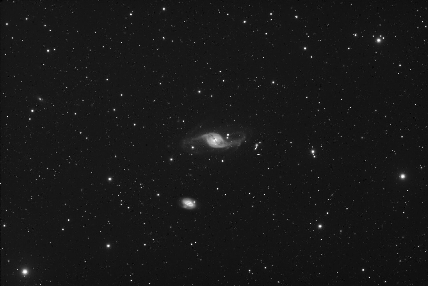 Bonjour à tous, L'une des image qui m'a demander le plus de temps de traitement de toutes celle que j'ai pu faire!! Une vrai galère à gérer le Ha afin de l'incorporer correctement sans complètement détruire le naturelle de la galaxie (bon ok quand on ajoute du Ha c'est pas vraiment pour faire naturel à la base ^^) et un bon équilibre des couleurs. J'ai recommencé 3x de 0 🥵 mais je pense avoir trouvé un bon équilibre entre visibilité du Ha et couleur de la galaxie L'image est clairement différente d'une version sans Ha et certain préfèrerons cette dernière que je n'ai pas trop trop travaillé mais l'exercice avec le Ha est super intéressant et révèle les alentours chargé de ce gaz. L'image est réalisé depuis mon remote en Espagne avec une FRA600 et une caméra FullFrame (pas de mosaique) ça rentre tout juste. l'image est constituée comme suit: Ha: 7h 50' L: 14h 50' R: 2h 30' V: 2h 10' B: 2h 10' Pour un total de 29h 30' La Version Ha avec quelques Crop de quelques zones d'intérets. Voici la version Sans Ha Voilà chacun aura ses propres goût mais clairement celle sans Ha pourrait être travaillée encore plus je me suis pas attardé au vu du taf de fou que la version avec Ha à demandée Merci de vos commentaire20 points