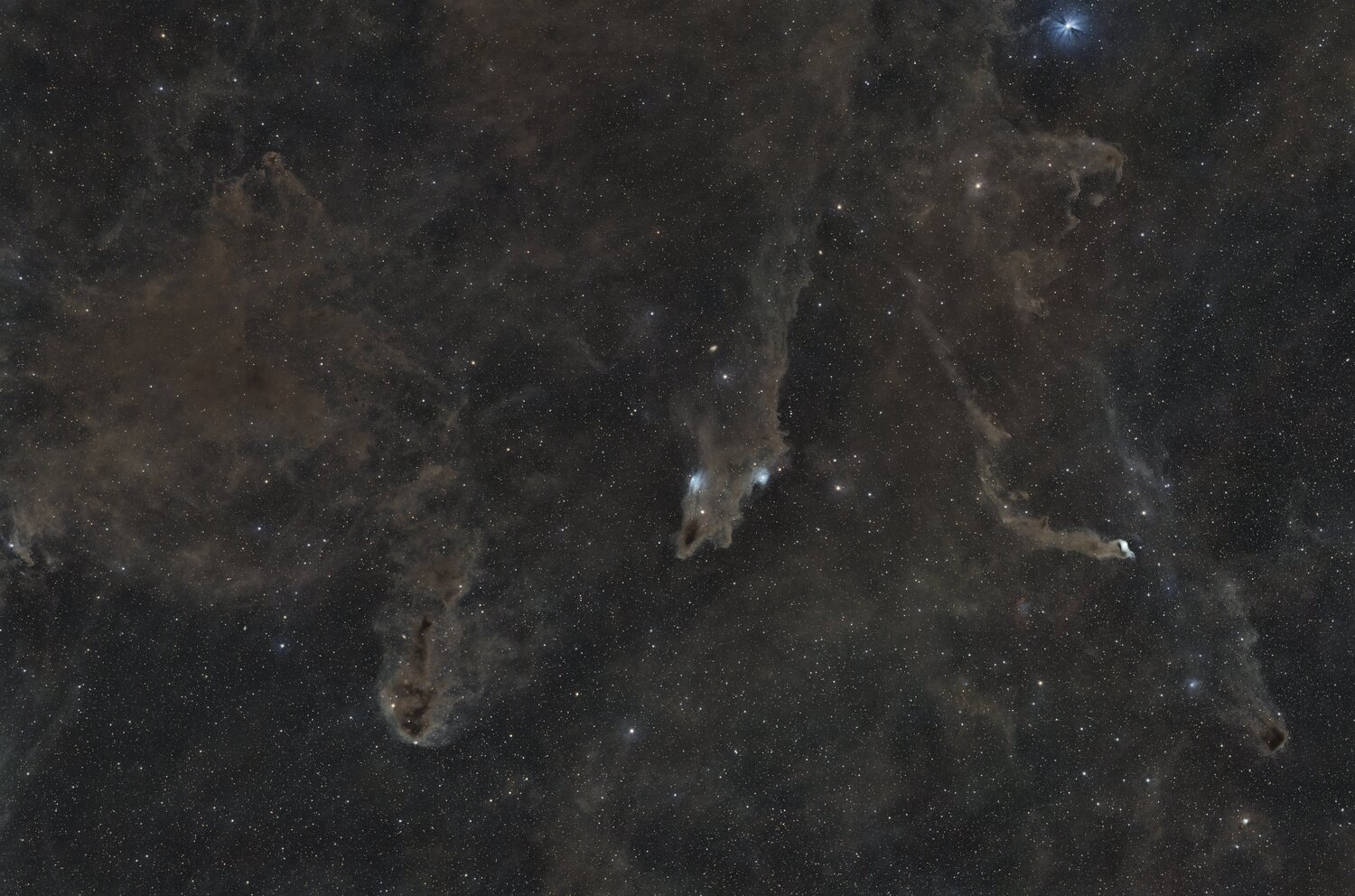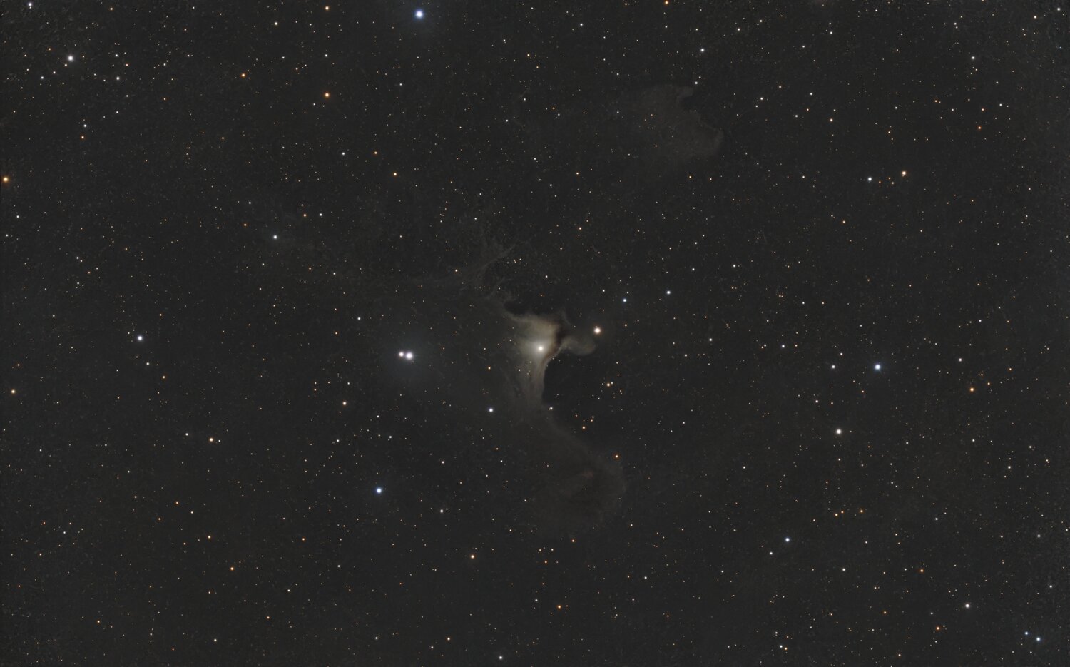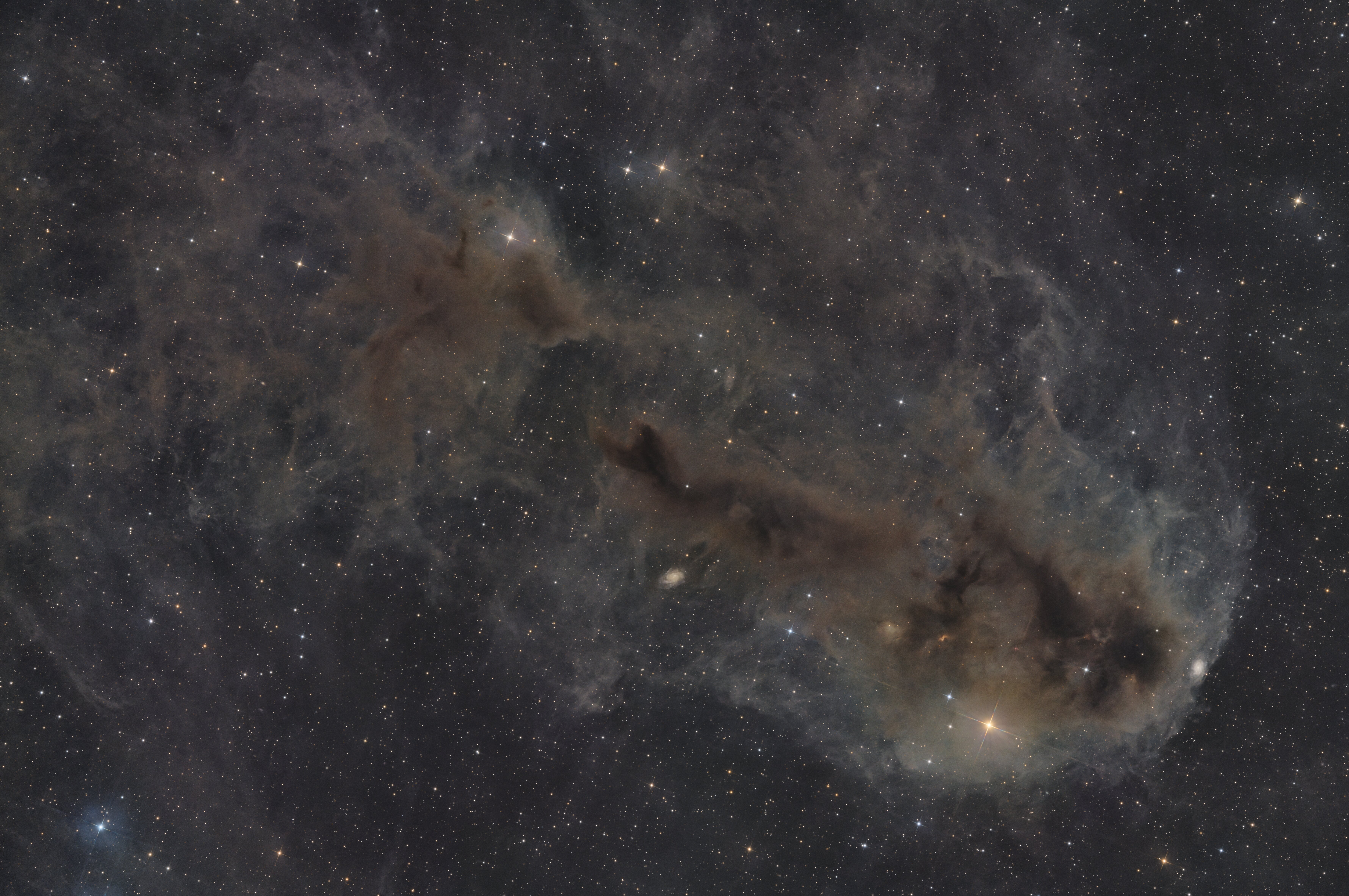 Bonjour à tous, Première sortie astro après les vacances pour moi. J'étais un peu rouillé mais j'ai quand même sortie mes 2 montures pour viser la région de Céphée et ses nébuleuses sombres. La première image est un gros plan sur LDN1251 réalisé avec le matériel suivant Newton ONTC 200/900 + réducteur de focale Starizona 0.75 (soit une focale exacte de 650mm) Une caméra ASI2600MC + filtre UV/IR-cut une monture Ioptron CEM40 Pilotage avec un Asiair Pro: 116 x180s: La deuxième image est un champ large de la même région dans laquelle on peut notamment voir les nébuleuses sombres suivantes: LDN1251, LDN1235 (le requin) et LDN1217 (j'ai désormais imagé ces 3 nébuleuses avec mon newton). Ce champ large a été pris avec le matériel suivant: Samyang 135mm ouvert à f/2.4 Canon 2000D défiltré monture Skywatcher AZ-Gti Pilotage avec un Asiair mini 200x90s: Bonne fin de vacances et bonne rentrée à tous. Nico18 points