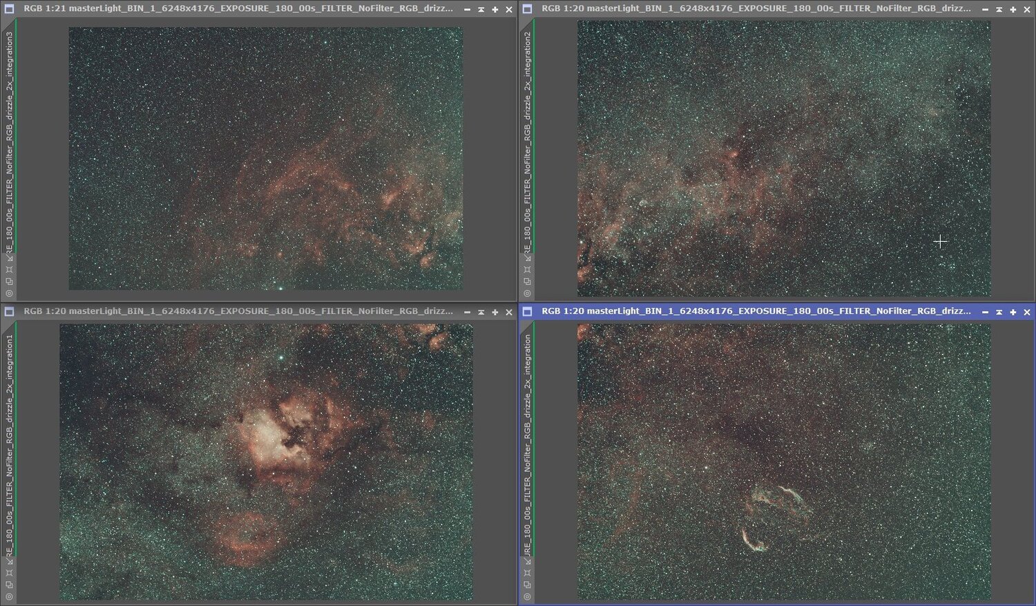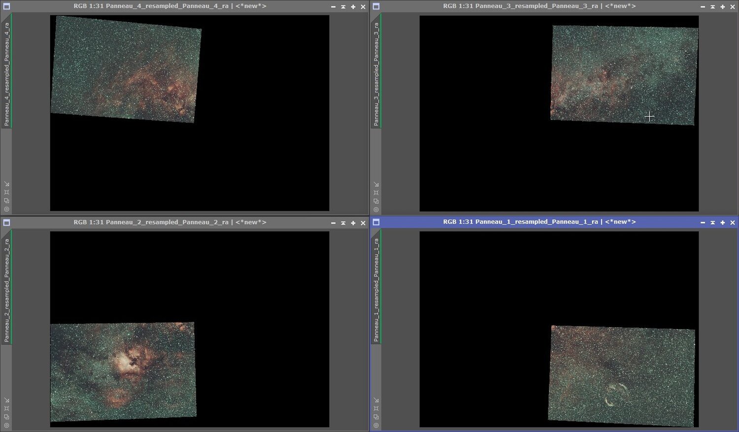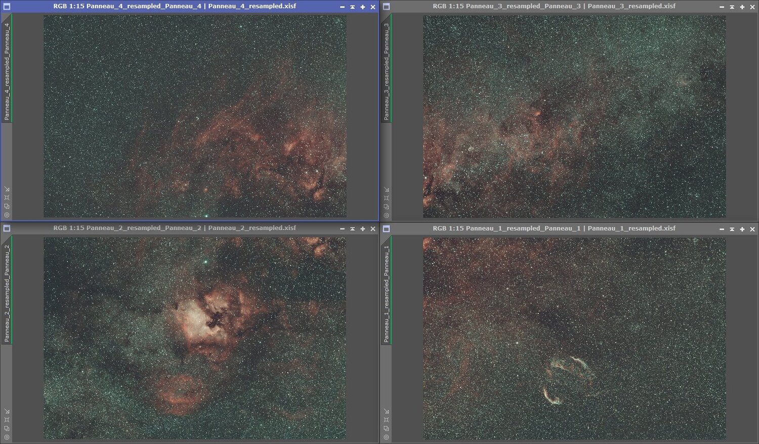 Bonjour à tous, J'ai retraité récemment une mosaïque de la région du Cygne que j'avais shooté en 2023. Grace à certains des nouveaux outils de Pixinsight, le traitement a été largement facilité et je me suis dit que je pouvais faire un post sur la façon dont j'avais procédé histoire de partager les techniques. J'évoquerais ici uniquement la réalisation de la mosaïque elle même, jusqu'à la jointure finale. Et je ne parlerais pas du traitement qui vient après. En gros, la mosaïque repose sur 3 étapes: la préparation des panneaux (notamment la correction de leurs gradients) l'alignement des panneaux sur la géométrie finale grâce à MosaicbyCoordinates La jointure des panneaux grâce au Script PhotometricMosaic. A noter que ce dernier script n'est pas un script de base de Pixinsight. Il faut ajouter un "repository" pour pouvoir en bénéficier (https://www.astroprocessing.com/repository.html) Présentation des images: Il y a 4 panneaux de la région du Cygne shooté avec ma caméra ASI2600MC, un objectif Tamron de 85mm et un filtre duo-band (Ha-OIII) Antlia APL-T. Les panneaux ont été prétraités avec du drizzle x2. Voici ce que donne les 4 panneaux brutes en sorties de prétraitement: Préparation des Panneaux Correction des étoiles Malheureusement, à l'époque de l'acquisition, j'avais encore des problème de réglage de backfocus et de rigidité du montage entre la caméra et l'objectif. Du coup, les étoiles dans les coins des panneaux sont très mauvaises: C'est un problème pour les mosaïques car cela va provoquer des artefacts au niveaux des jointures et il faut donc essayer de corriger ça. La première chose que j'ai fait est de séparer les canaux (avec le process ChannelExtraction) puis de les réaligner (avec le process StarAlignment) en prenant le canal vert comme référence et en activant la prise en compte de la distorsion et enfin de recombiner les canaux (avec le process ChannelCombination). Cette opération permet de limiter les décalages chromatiques (visibles notamment dans le coin en haut à gauche) de l'image d'origine. Et puis application de Blurx en mode "correct only": Le résultat n'est pas parfait et ça ne remplace pas une acquisition plus soignée mais on évite ainsi un certain nombre de problèmes au moment de la jointure des panneaux. Après avoir réalisé ces opérations il est bien de refaire une résolution astrométrique des panneaux pour avoir la solution la meilleure possible pour les étapes d'après. Correction des gradients L'étape suivante est la correction du gradient. Avec les outils de retrait traditionnels (comme DynamicBackgroundExtraction), j'avais toujours des problèmes pour les mosaïques. Même si le gradient était visuellement parfaitement corrigé sur les panneaux individuels, le retrait était fait de telle manière que les panneaux n'était plus vraiment "compatibles" entre eux et cela donnait alors des transitions visibles au final. Grace au nouvel outil de correction du gradient de Pix: MultiscaleGradientCorrection (MGC) qui se base sur l'approche décrite ici (https://pixinsight.com/tutorials/multiscale-gradient-correction/ ) on a un outil qui permet un retrait objectif des gradients et donc des panneaux qui se joignent parfaitement après le retrait. Par contre, comme il s'agit d'une image narrowband, il faut faire un peu attention pour utiliser MGC correctement. Le préalable est d'utiliser l'outil SPFC qui va permettre de calibrer les flux de l'image avec les réglages correspondant au filtre utilisé (ici le Antlia-ALP-T): Une fois ce préalable fait on peut alors appliquer MGC avec les réglages suivants: Après avoir réalisé ces opérations sur les 4 panneaux, on a désormais le résultat suivant: Resample Afin de limiter les temps de calculs des opérations suivante et pour avoir une géométrie finale de taille raisonnable j'ai choisit de resampler les panneaux individuels à 75% en utilisant le Process Resample de Pix. Avec des images sous-échantilloné comme celles-ci, il faut faire attention à l'algorithme utilisé car ils vont avoir un impact important sur l'aspect final des étoiles et il peuvent provoquer des artefacts sur ces dernières. Ici j'ai choisi l'algorithme "Bicubic-Spline" avec une réglage de "Clamping Threshold" à 0,1. A noter que le resample va supprimer la solution astrométrique des images et qu'il faut donc la recalculer avec ImageSolver pour chaque panneaux. Alignement des Panneaux L'alignement des panneaux sur la géométrie de la mosaïque est réalisé avec le script MosaicbyCoordinates. En lui passant en entrée les 4 panneaux, celui ci va déterminer automatiquement les caractéristiques de la géométrie finale et va aligner les 4 panneaux sur celle-ci. Comme avec le resample, il faut faire attention à l'algorithme d'interpolation utilisé. Voici un exemple de la différence entre l'algorithme Bicubic Spline et les réglages par défaut de MosaicbyCoordinates Une fois le script terminé, on obtient les 4 images suivantes: Jointure des Panneaux Il reste alors à joindre les panneaux avec le script PhotometricMosaic. Je ne suis pas sûr que ce soit absolument nécessaire mais l'auteur du script PhotometricMosaic recommande de supprimer quelques pixels en bordure des images avant de les joindre. Il propose un script dédié à ça: TrimMosaicTile (qui vient dans le même repository que PhotometricMosaic). J'ai donc enlevé 5 pixels de chaque coté des 4 panneaux. Le script PhotometricMosaic lui même est assez complexe ( il est par contre très bien documenté) mais Il est à mon sens largement préférable au vieux script natif de Pix: GradientMerge mosaic. Le principe est qu'il utilise la photométrie des étoiles pour mettre les panneaux à l'échelle et pour gérer les zones de transition. Cela donne en général d’excellents résultats. Son seul point faible est qu'il ne peut joindre des panneaux que 2 à 2. Il faut donc procéder par étapes et cela 