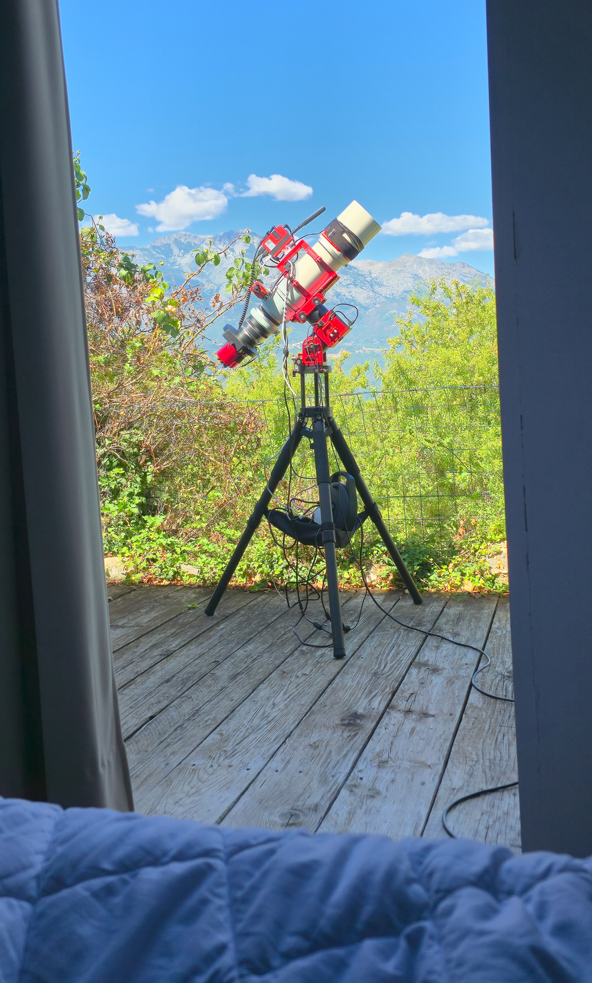 Bonjour à tous, je suis actuellement en Corse pour animer des soirées astro pendant 15 jours aux clients du gîte Stelle di Corsica, c'est ma 3ème année. Une fois les clients couchés, je profite du cadre exceptionnel pour engranger les poses avec la FSQ Pour plus de détails sur le gîte et l'observatoire : https://stelle-di-corsica.com/ L'observatoire dispose d'un C11 sous coupole pour les planètes et objets courants, d'un T200 Skyvision pour les présentations en live-stacking sur grand écran, et enfin d'un T600 Skyvision entièrement automatisé pour les visiteurs ou clients plus aguerris. Le deal avec le gite est le suivant : en échange de l'animation chaque soir auprès des clients, les chefs de mission bénéficient d'un logement pour 2 personnes gracieusement et l'accès permanent à l'observatoire, le tout pendant 2 semaines en période estivale. C'est un bon deal je trouve Une photo du setup vu depuis mon lit Mon logement est juste à côté de l'observatoire. Le setup complet voyage avec moi en avion, l'AM5 avec son trépied dans la valise en soute, et la FSQ avec sa caméra en bagage cabine. Comme je ne peux pas emporter ma grosse batterie, j'emmène 2 alim 220/12V (une pour l'ASiair, l'autre pour l'AM5). Depuis mon arrivée le 26 juillet, je n'ai eu qu'une seule nuit nuageuse, vive la Corse J'ai donc passé 5 nuits sur cet objet, ce qui constitue mon record à ce jour ! Passons maintenant au champ imagé. Voici NGC6888 ou la nébuleuse du Croissant, accompagné de la Bulle de savon. NGC6888 est la conséquence des jets de matière dus au violent vent solaire de l'étoile supermassive WR136. Pour l'anecdote, la nébuleuse planétaire de la bulle de savon (PN G75.5+1.7) a été découverte le 6 juillet 2008, soit seulement 2 jours avant que mon ami Fred Guinepain ne l'image à son tour et se demande ce qu'était cet objet. Aujourd'hui avec les techniques actuelles, tout le monde connait cette fameuse bubulle Matériel utilisé : - FSQ106 au foyer + ASI2600MM + EFW + filtres 36mm ZWO - guidage par OAG-L ZWO + ASI290 mini - monture ZWO AM5 + trépied carbone TC40 - le tout piloté par ASiair Plus + 2 CPL Prises de vue : - 86 poses de 180s en Ha retenues - 100 poses de 180s en OIII retenues - 50 poses de 30s par couleur en RVB pour obtenir la couleur des étoiles Soit un total de 10h55. - Prétraitement sous SiriL 1.4 béta - Création des couches HOO et RVB avec composition RVB sous SiriL - StarX sous Pix pour la couche RVB (étoiles) ainsi que la couche HOO (starless) - BlurX + NoiseX sous Pix pour la couche HOO - Réduction d'étoiles et recombinaison des couches RVB et HOO le tout sous SiriL - couleur par SPCC sous SiriL - finition sous CS5 J'ai traité l'image avec mon PC portable dont l'écran n'est pas calibré, je ne sais pas ce que ça donne au niveau des couleurs ou du fond de ciel. Merci de me dire Cliquez sur l'image pour obtenir la full : Ou encore ici : http://colmic.astrosurf.com/Corse/NGC6888_86H_100O_180s_50RVB_30s.jpg18 points