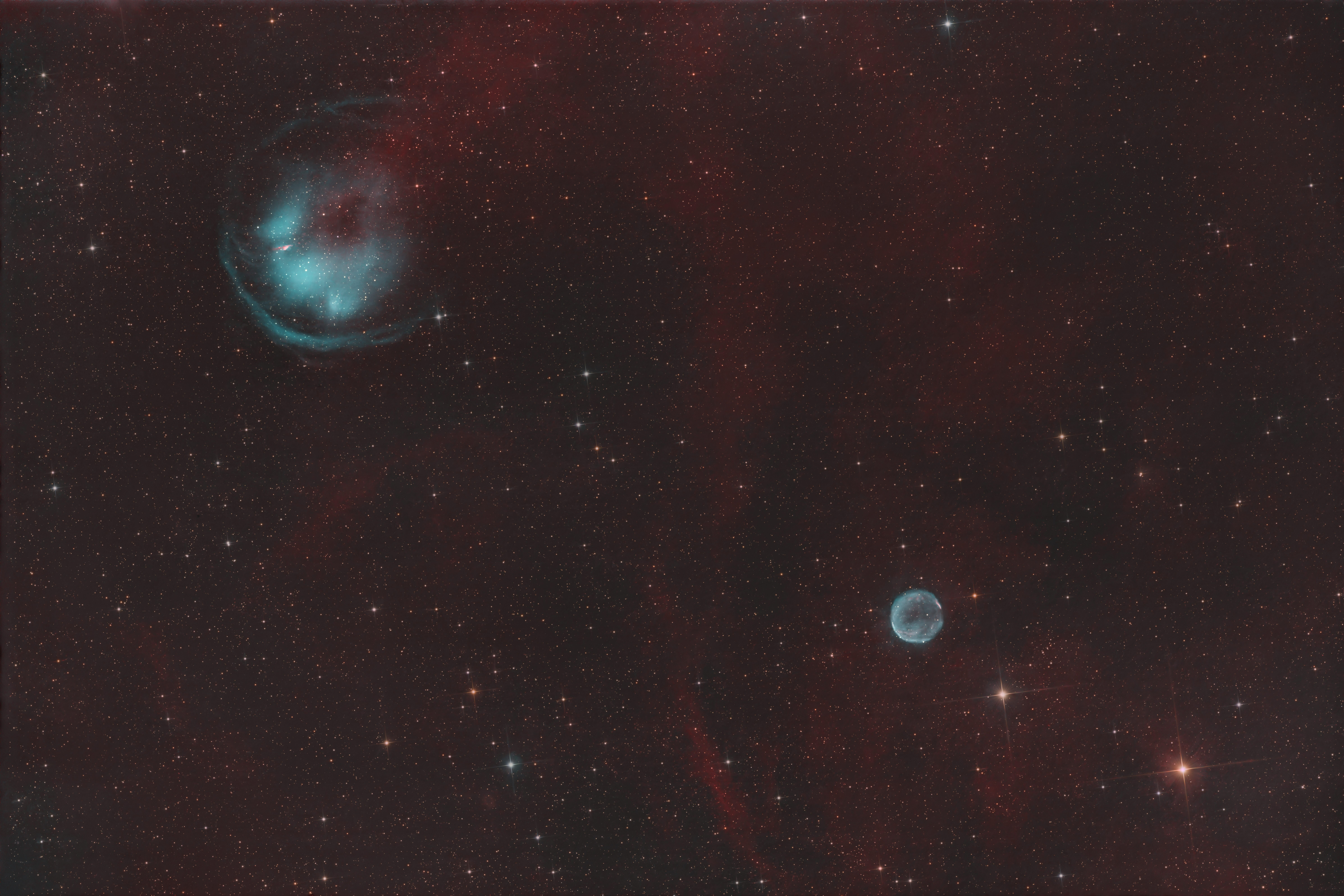 Salut, inspiré par @sebseacteamj'ai tenté Abell 6 (ou PK146+4.1) accopagné de HFG1: Julien @180Vision nous avait également sorti une superbe version. Une fois n'ai pas coutume, j'ai posé 9H30 sur 2 nuit anvec l'Antlia 3nM dual band les 6H en RGB ne donnant rien. J'ai battu mon record de poses là. Galère de WBPP malgré mon CoreI9 et mes 128Gb de RAM pour 140 brutes aux taquets. Il faut que je m'achète une maxiCam32 plutôt que la 6200 OSC...👺 pour passer le temps (mettre l'ampli sur 12😃😞 Ca y est on a l'image! pour les pressés le crop de PK146+4.1 (Mag 16 quand même😮😞 et pour les amoureux du full frame: avec sa copine.😃 a vos commentaires a+ Serge17 points