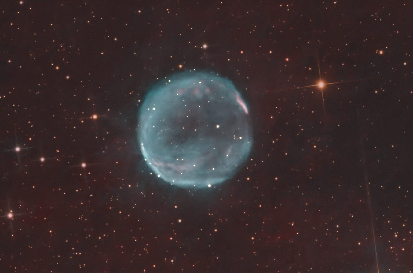 Bonjour à tous, Je vous présente ma version de cette nébuleuse située dans le grand chien. Compliquée à imager sous nos latitudes (elle culmine au mieux à environ 20°, et qui plus est, plein sud donc dans la pollution de la ville en ce qui me concerne), j'ai profité de mon setup portugais pour la mettre dans la besace. Il s'agit d'une acquisition en HOO complétée par une couche RGB pour les étoiles. 27 heures d'acquisition ont été nécessaires pour ce résultat. Avec du recul, la couche Ha en aurait méritée encore un peu je pense. SH2-308 est une bulle de Wolf-Rayet, générée par l'étoile Wolf Rayet EZ Canis Majoris au centre de la nébuleuse. Les rayonnements et vents stellaires de l'étoile, en éjectant la matière, créent cet effet de bulle. Sur la gauche de l'image, le nuage de gaz ou se mêle Oxygène (en bleu) et Hydrogène (en rouge) est une autre entrée du catalogue sharpless (SH2-303) De nombreuses petites galaxies se nichent dans l'arrière plan en parcourant la pleine résolution, ainsi que 2 nébuleuses planétaires (PK 233-10.1 en haut à gauche de l'image et PNG 234.9-09.7 juste sous le dauphin). Le lien vers la pleine résolution et les détails d'acquisition sur mon compte astrobin : [https://www.astrobin.com/tfvjjr/]19 points