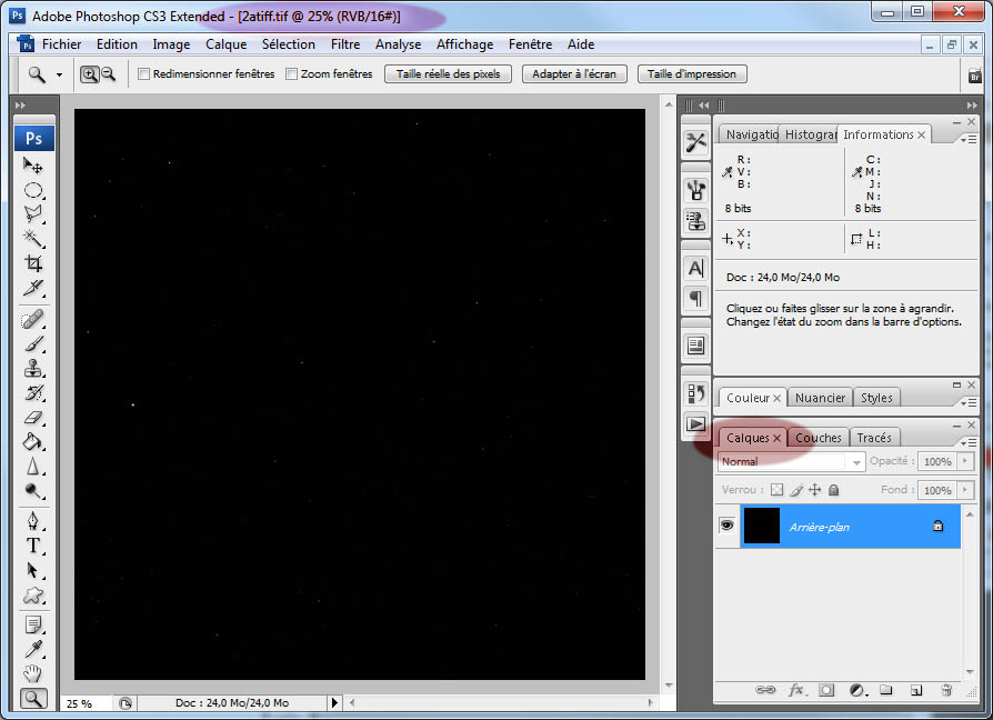 1. On ouvre l'image au format '.tif' (16 bits) sortie d'IRIS ou DSS. notez que cette image est 'brute d'empilement'. Elle n'a subi aucun traitement, on n'y voit d'ailleurs pas grand-chose et c'est très bien ainsi. A chacun son job, les logiciels d'astro 'empilent' puis PhotoShop 'traite' l'image.