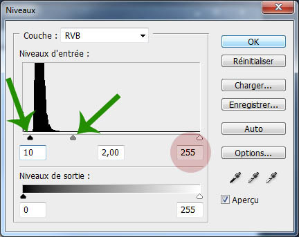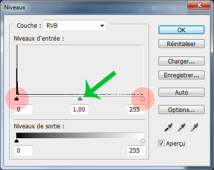 Cette fois, on va 'encadrer' la courbe avec les curseurs de gauche (tons sombres) et du milieu (tons moyens). Le but est de révéler les détails en évitant de trop faire monter le bruit. Surveillez donc l'écran principal pour voir l'effet de cette manipulation. Cochez 'Aperçu' si ce n'est déjà fait.