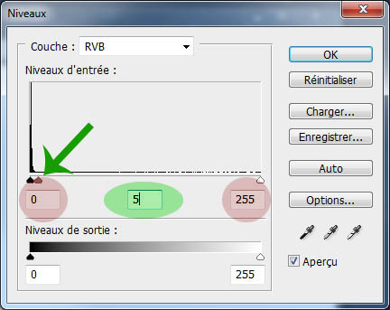 Cadre 2: pour révéler les détails on déplace le curseur du milieu (tons moyens) vers la gauche, jusqu'au pied de la courbe et on clique OK.