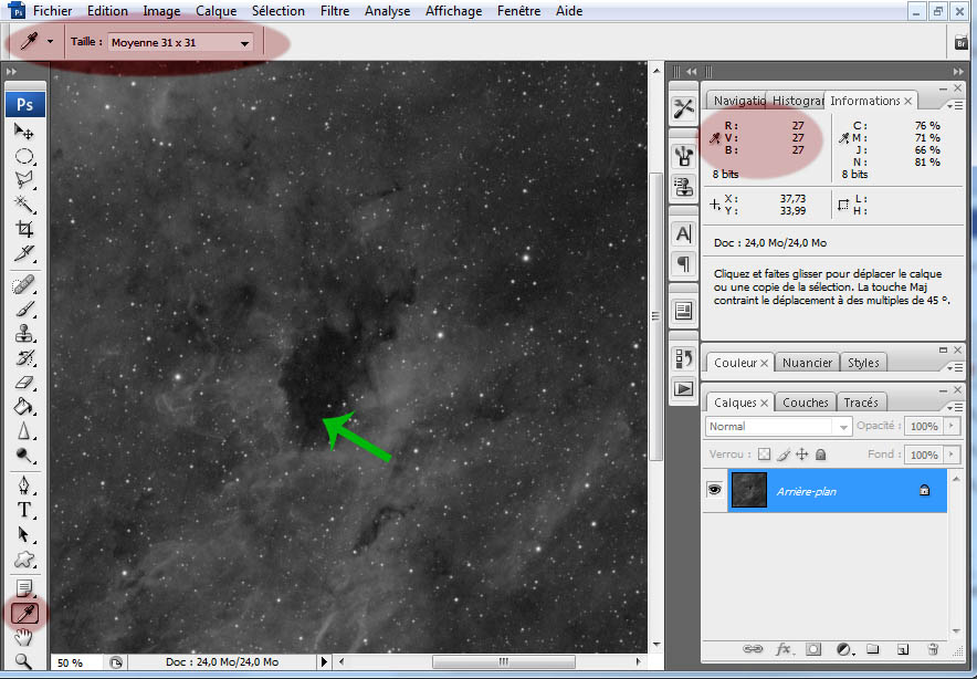 3. Vérifiez avec l'outil 'pipette' que les zones noires ne le sont pas trop. Une image astro 'idéale' n'est réellement noire nulle part (comme le ciel d'ailleurs). Idéalement, le 'noir' devrait être un gris foncé entre 20 et 30 sur 255 (vérifiez dans la fenêtre 'Informations'). Par ailleurs, une zone de l'image à zéro ne possède plus aucune nuance, plus de signal: à éviter absolument!