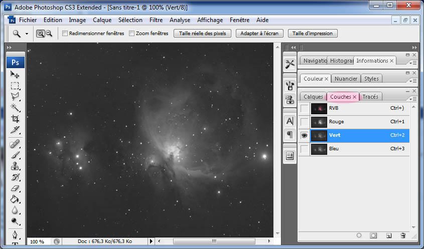 En cliquant sur la couche verte de l'image, on peut d'ailleurs constater que celle-ci est plus 'riche'. Elle contient plus de détails que le rouge ou le bleu. On peut souvent pousser plus loin les niveaux sur cette couche.