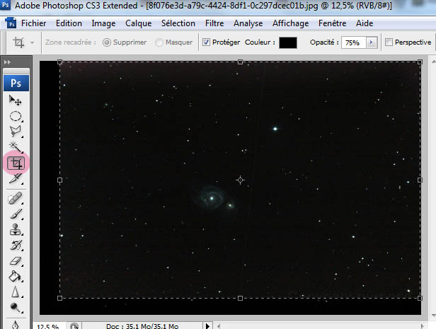 1. Bien souvent, le résultat du prétraitement ou de la capture affuble l'image finale de bords disgracieux. Ou alors les coins de l'image sont assombris par le vignettage ou déformés par l'optique. Pour toutes ces raisons il peut être judicieux de couper ces parties dégradées pour ne garder que le meilleur de la photo. On peut aussi vouloir améliorer la composition de la scène, en plaçant les objets sur une des 'lignes de force', au tiers du cadre. On utilise alors l'outil 'Recadrage'. Clic-droit dans l'image pour appliquer le recadrage ou annuler.