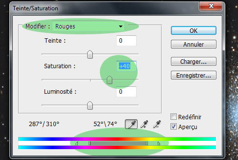 Souvent, les images astro brutes manquent de couleurs, ou certaines couleurs sont exagérées. L'outil 'Teinte/Saturation' permet de corriger le tir.
