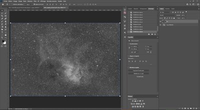 Starnet++ a tendance à rendre l'image starless plus lumineuse que l'image originale, je ne sais pas pourquoi... Peut-être un réglage à faire que je ne connais pas. En attendant, je rattrape le coup avec un calque d'effet "Niveau" et en créant un petit masque circulaire sur l'image originale (la Ha ici) pour comparer les deux et régler finement: