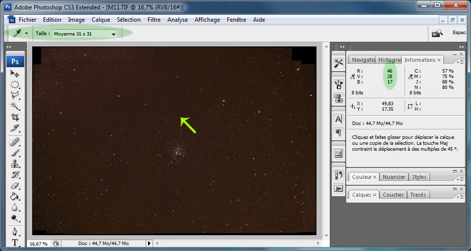1. On ouvre l'image et on configure l'outil 'pipette' en mode 'moyenne 31x31'. Selon la photo, une valeur plus grande peut donner des résultats plus stables, faites quelques essais.