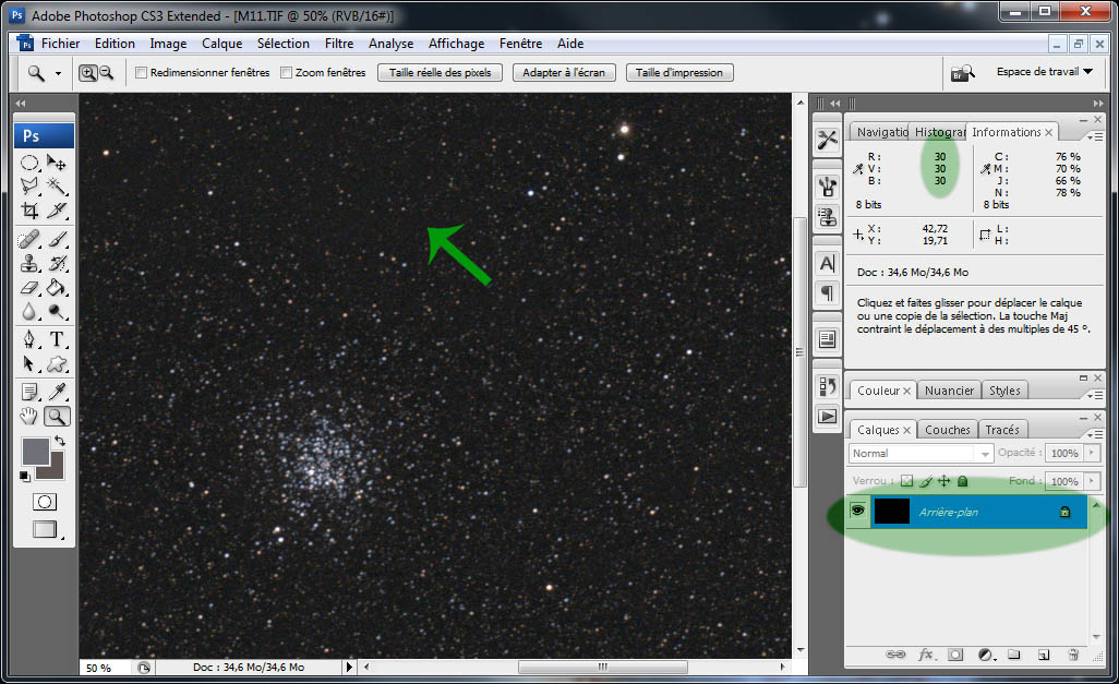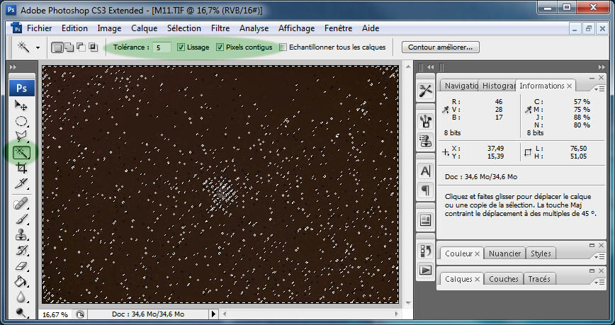 Promenez la souris dans une zone sombre du ciel, proche du centre mais pas sur l'objet imagé. Notez les valeurs R,V,B dans la fenêtre 'informations': 46, 28, 17.
