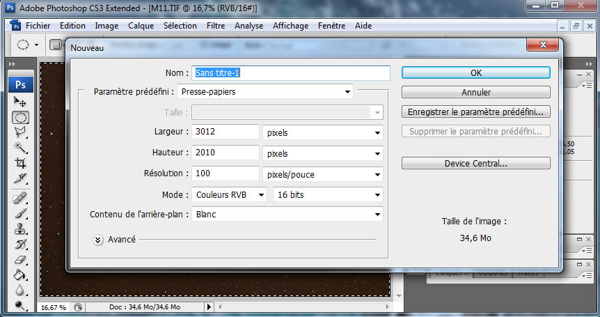 3. Menu ==> Fichier ==> Nouveau. Une fenêtre avec une zone de travail de la même taille que votre image s'affiche dans un document 'Sans titre-1'.
