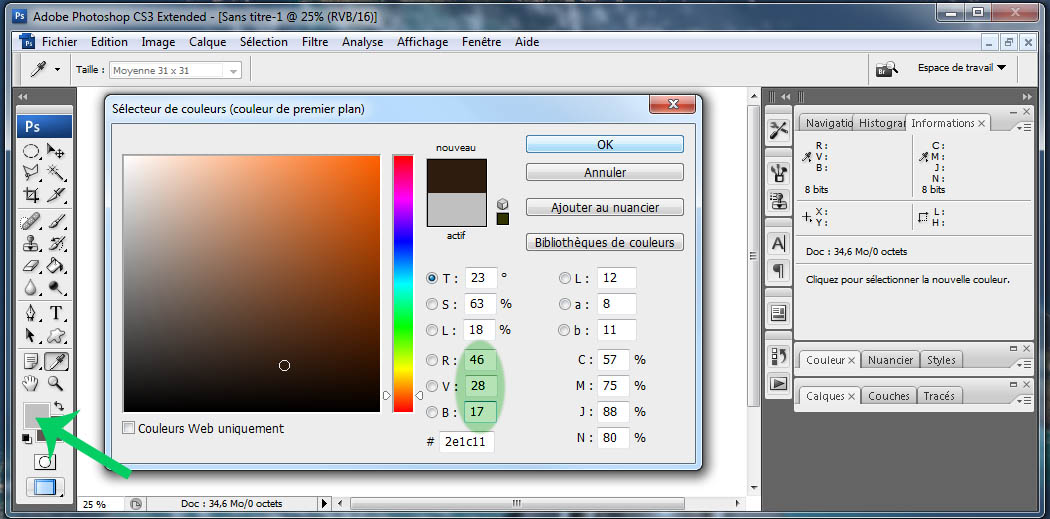 4. Changez la couleur de premier plan, remplissez les valeurs R, V, B notées plus haut: 46, 28, 17.