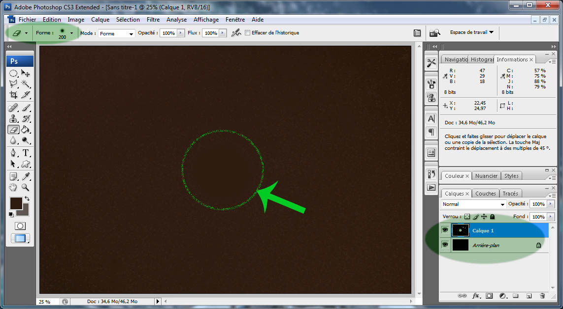 6. Collez la sélection réalisée au point (2) avec Ctrl-v. Un nouveau calque apparaît, il est dénommé 'Calque 1'. Si des traces de l'objet imagé subsistent dans la sélection, effacez-les à l'aide de l'outil 'Gomme floue'. Le cercle vert sur l'illustration indique la zone gommée.
