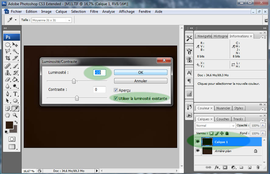 Menu ==> Image ==> Réglages ==> Luminosité/Contraste. Cochez 'Utiliser...' et diminuez la luminosité. Pour savoir de combien vous pouvez diminuer la luminosité, promenez la souris sur l'image et notez la plus petite valeur R, V ou B dans la fenêtre 'informations'. Il faut être certain de ne pas assombrir le masque au point de couper des informations. Dans l'exemple, la plus faible valeur se trouvait dans un coin de l'image. Le canal B (Bleu) était à 12. La luminosité a donc été diminuée de 10, pour laisser une légère marge.
