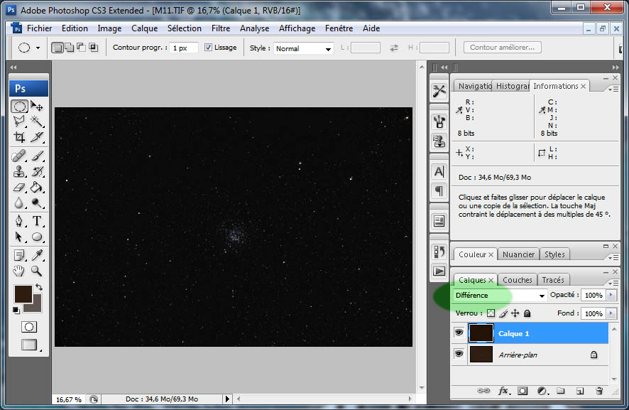 Attention, cette procédure peut échouer dans certains cas. Par exemple, si l'opération 'gomme' du point (6) est mal faite, il est possible que l'objet ou les grosses étoiles soient entourés d'une zone sombre. Retournez alors au point (6) en utilisant l'historique de PhotoShop.