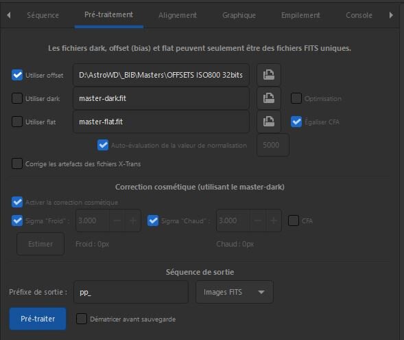 - On n'utilise pas le master OFFSET (on ne va pas le soustraire une seconde fois !). En revanche on utilise les master FLAT et DARK à aller chercher là où vous les avez copié.