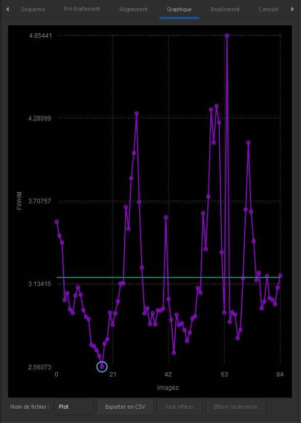 Siril va profiter de l'alignement pour analyser vos images et en calculer des valeurs de FWHM qu'il vous montre graphiquement sur cet onglet.